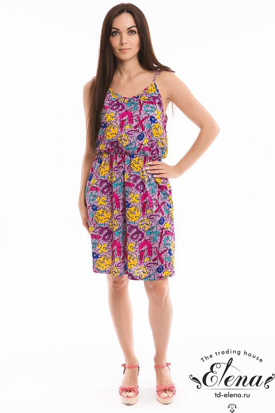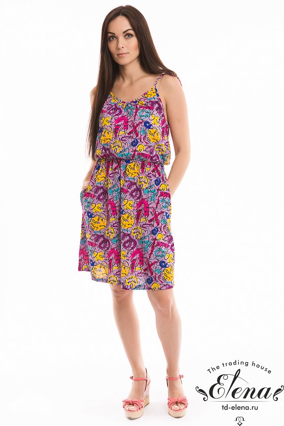 Сарафан на бретельках выполнен из х/б полотна с набивным рисунком. На резинке по талии и с карманами по бокам.