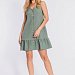 Сарафан с застёжкой на пуговицы выполнен из искусственного льна. Горловина V-образная, по низу сарафана широкая оборка. В боковых швах расположены карманы.
