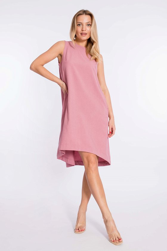Сарафан из однотонного искусственного льна. Силуэт сарафана трапециевидный, по бокам размещены два кармана. На спинке от кокетки две встречные складки, низ сарафана разноуровневый.