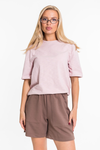 Шорты выполнены из футер петли с лайкрой. Пояс на резине, по бокам размещены карманы, а в качестве декора пришиты пуговицы.