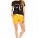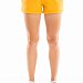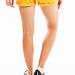 Шорты женские из футер петли с лайкрой. Для лучшей посадки по линии талии продёрнут шнур, а сзади в поясе проложена и зафиксирована эластичная резиновая тесьма. По бокам расположены карманы. Низ шорт оформлен отворотами.