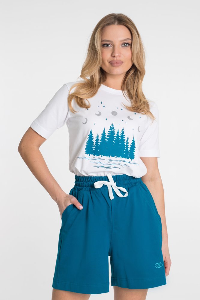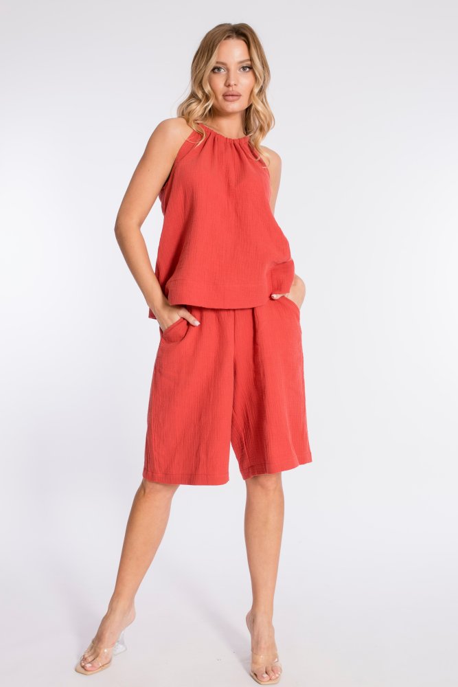 Шорты свободного кроя выполнены из муслина. Пояс на резине, по бокам размещены карманы.