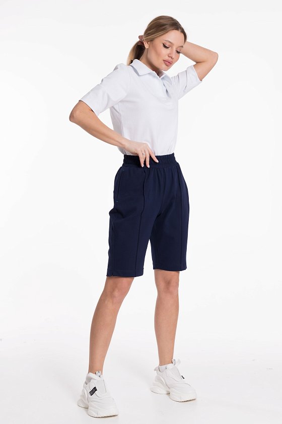 Шорты из полотна "пике". Удлиненные, пояс на резинке, в боковых швах карманы, внизу по боковому шву разрезы.