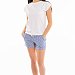 Шорты женские из х/б полотна с лайкрой. Для лучшей посадки по линии талии продёрнут шнур, а сзади в поясе проложена и зафиксирована эластичная резиновая тесьма. По бокам расположены карманы. Низ шорт оформлен отворотами.