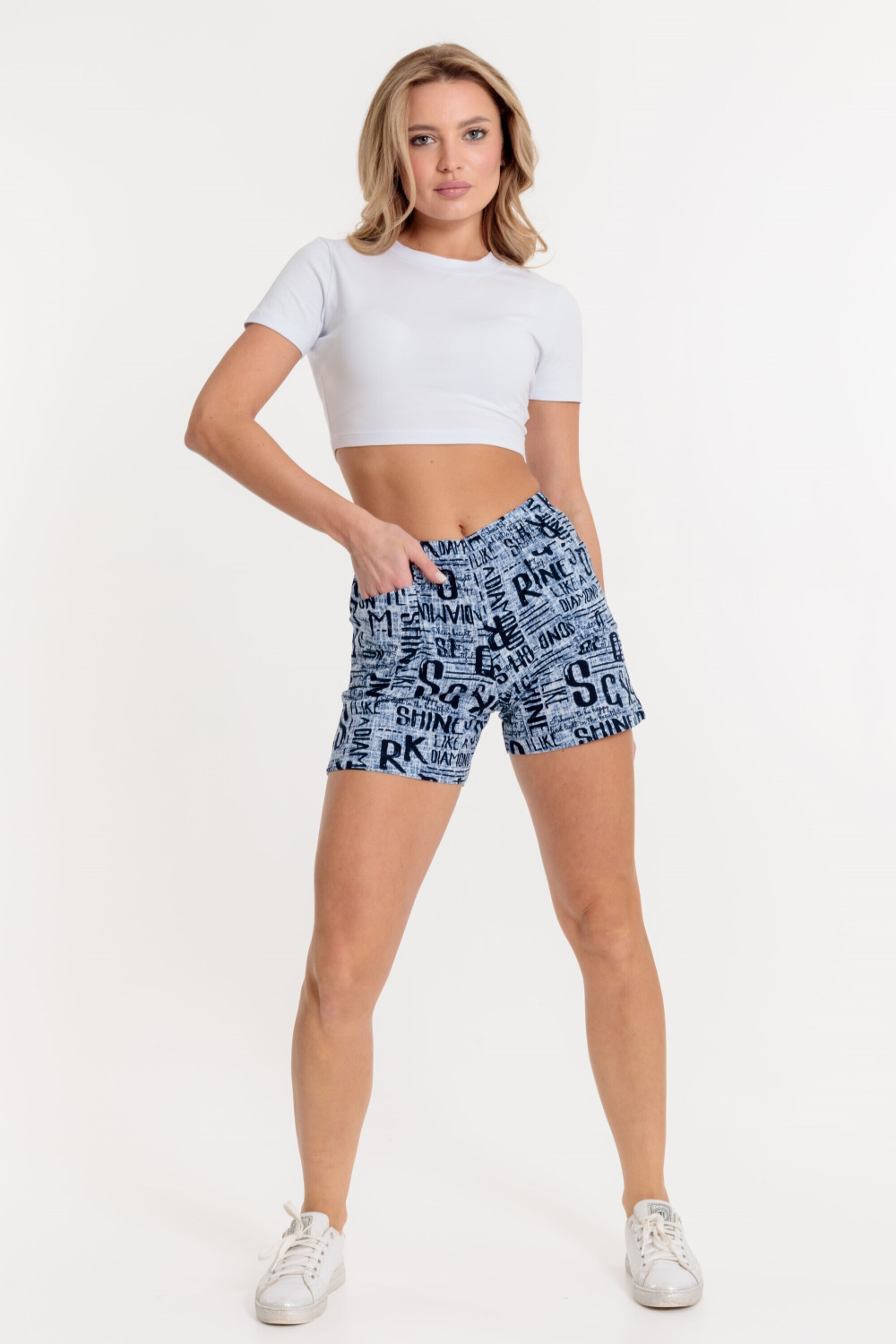Женские шорты выполнены из хлопковой ткани (набивка). Свободный прямой покрой, длина средняя. По бокам расположены накладные карманы. Данную модель шорт можно носить как дома, так и на пляже.