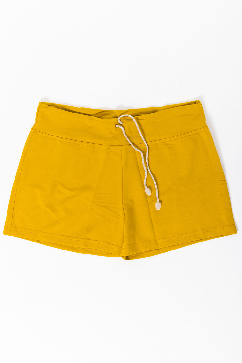Женские шорты выполнены из футер петли ярких расцветок. Силуэт облегающий, пояс широкий со шнурком. Без карманов.