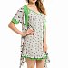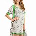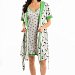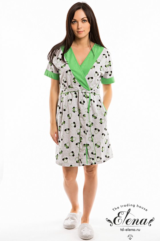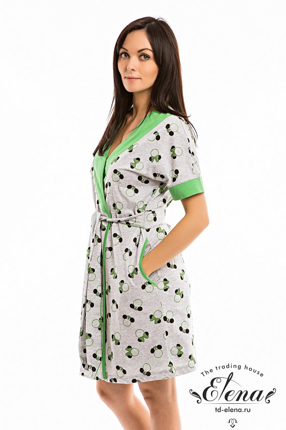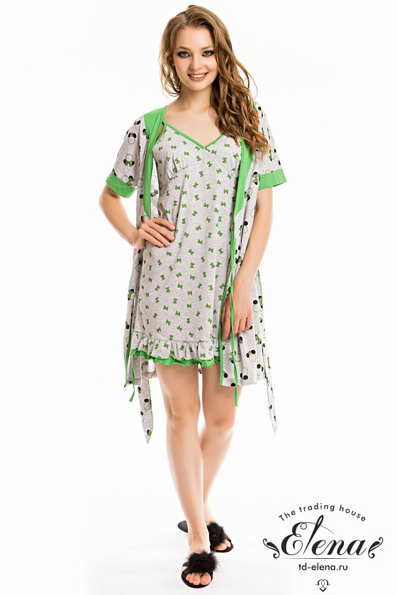 Комплект выполнен из кулирки, состоит из халата и сорочки. Халат на запах, с двумя карманами по бокам. Сорочка на тонких бретелях, с оборкой внизу.
