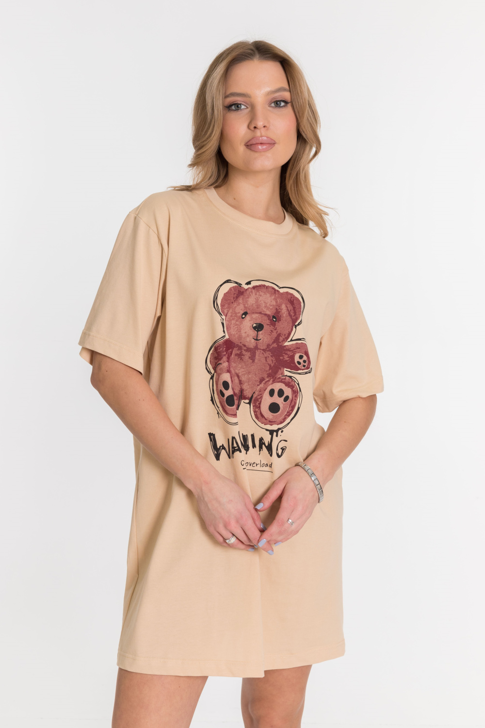 Сорочка по типу удлиненной футболки оверсайз из однотонной кулирки, рукав короткий, на полочке принт.