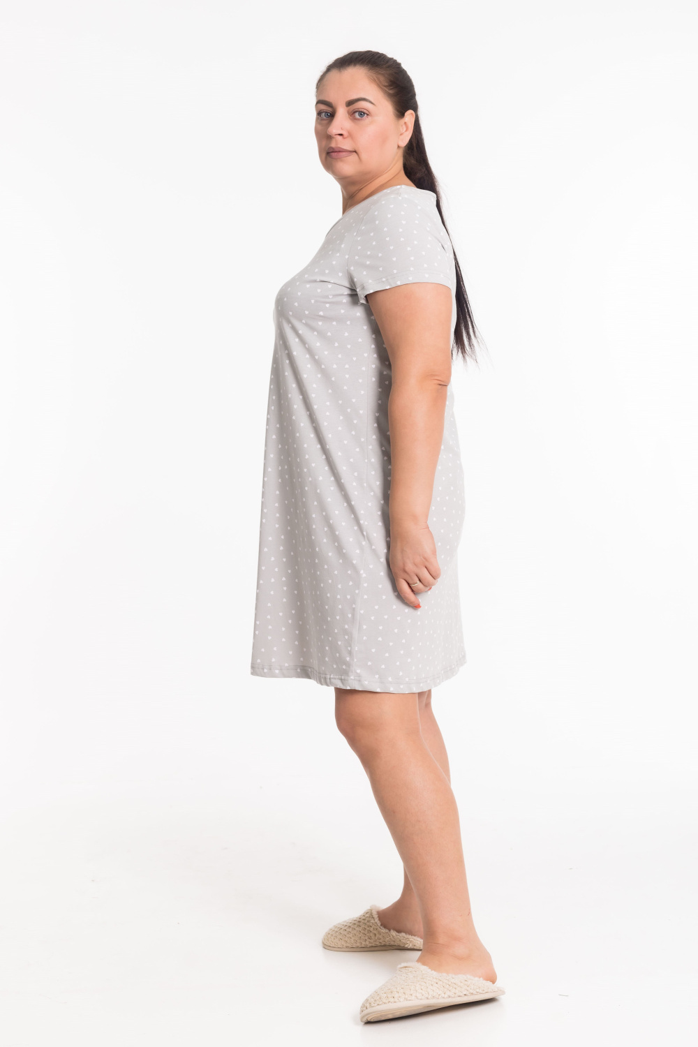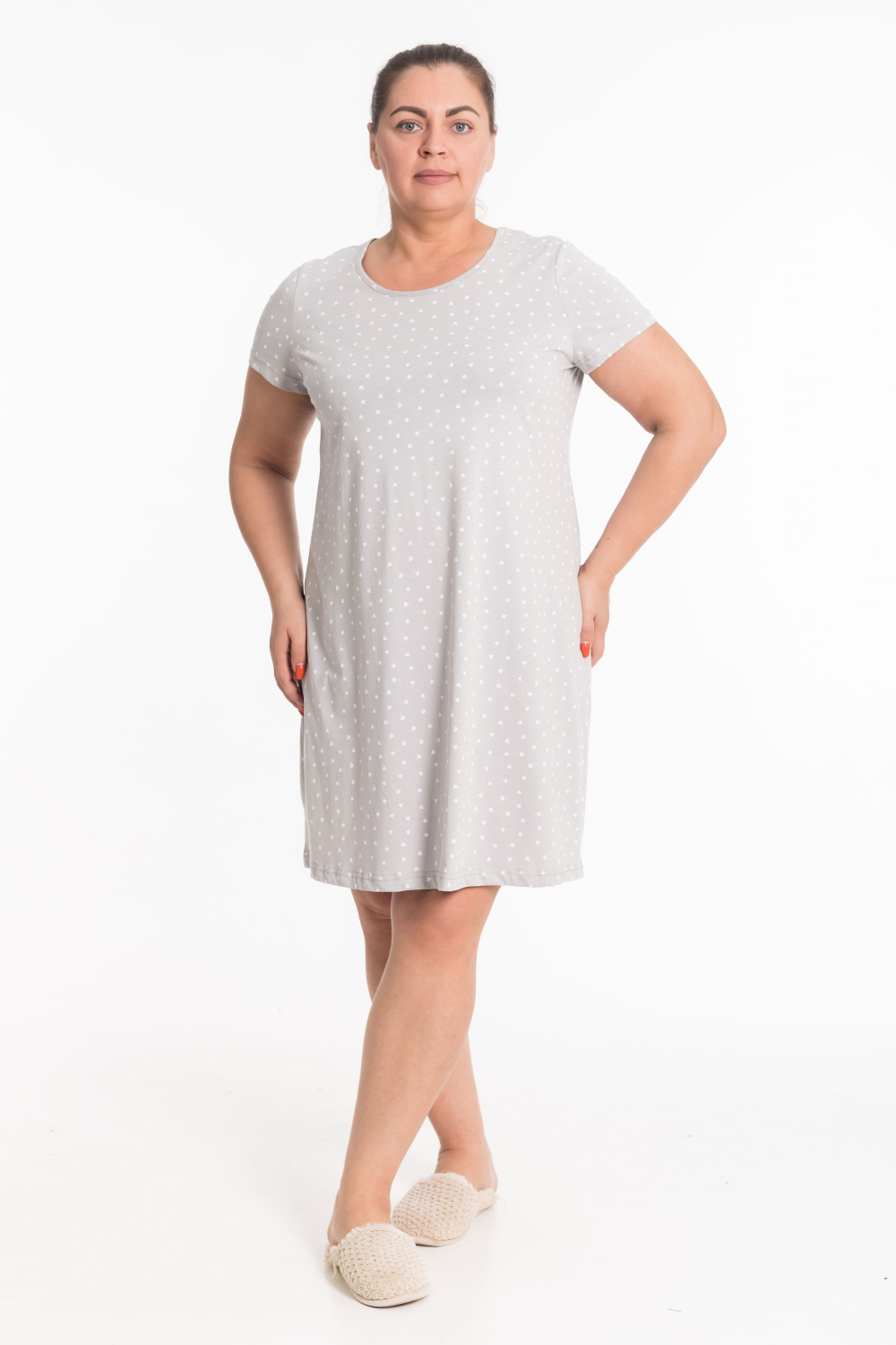 Сорочка выполнена из кулирки, 100% хлопок. Рукав короткий, втачной. Круглый вырез горловины, обработан бейкой. Такой дизайн сорочки позволяет свободно двигаться и чувствовать себя комфортно даже во время сна.