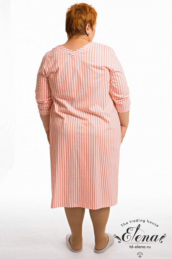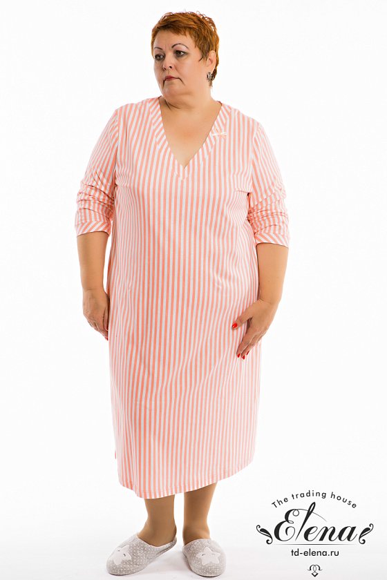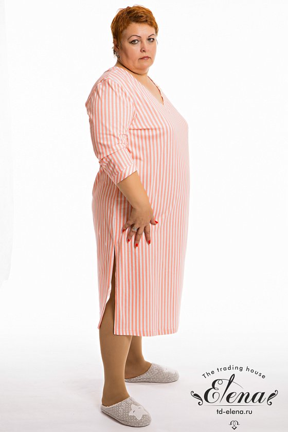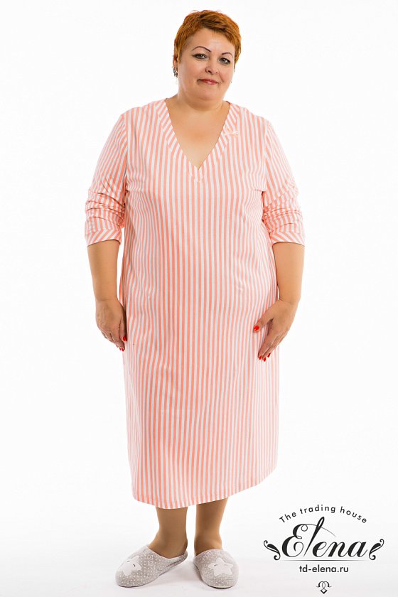 Сорочка женская из кулирки 100% хлопок набивка вертикальная полоска. С рукавом длиной 3/4. Горловина V-образная на полочке и спинке. По горловине и низу рукавов широкие планки по косой. В боковых швах разрезы. На полочке по горловине отделочный бантик.