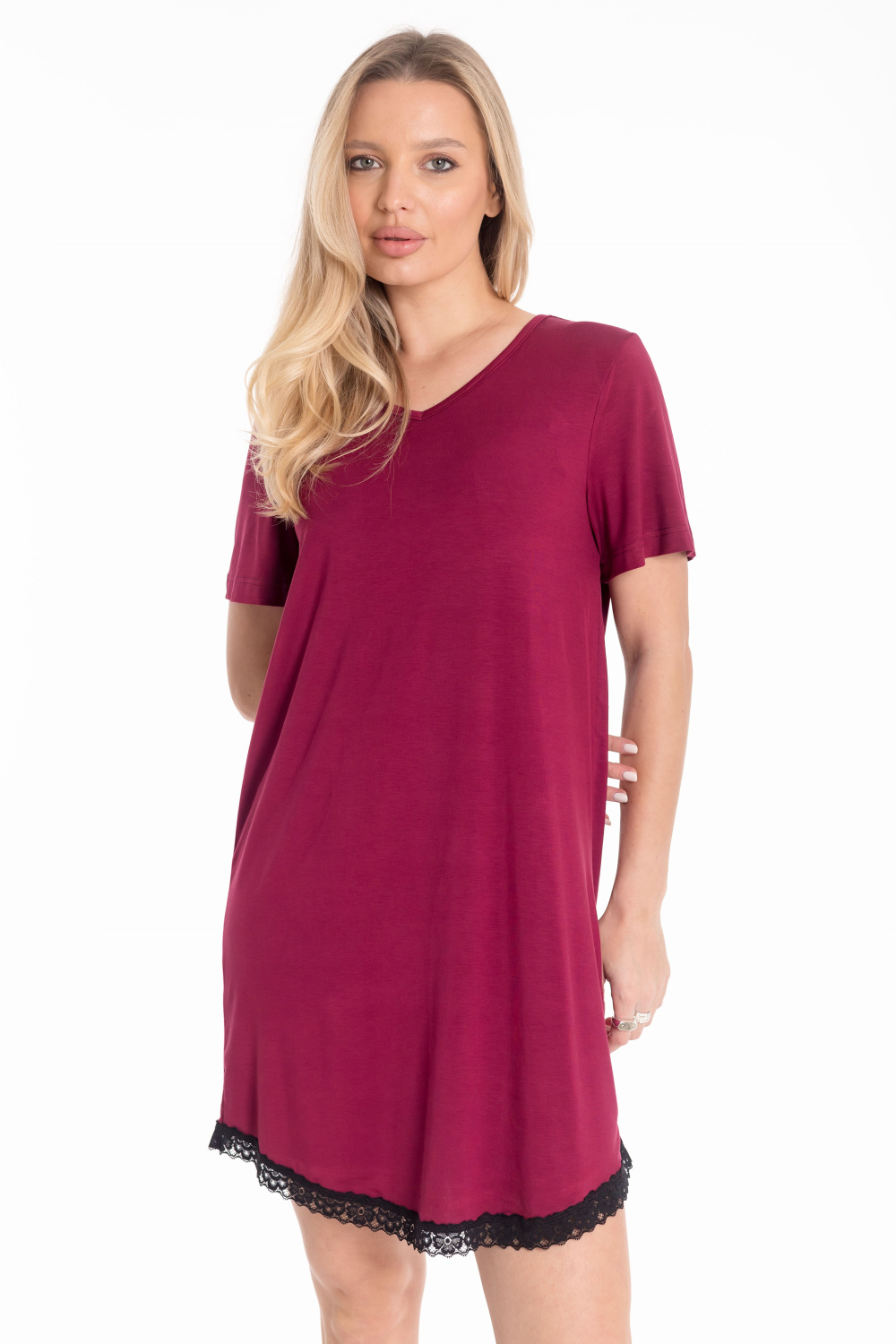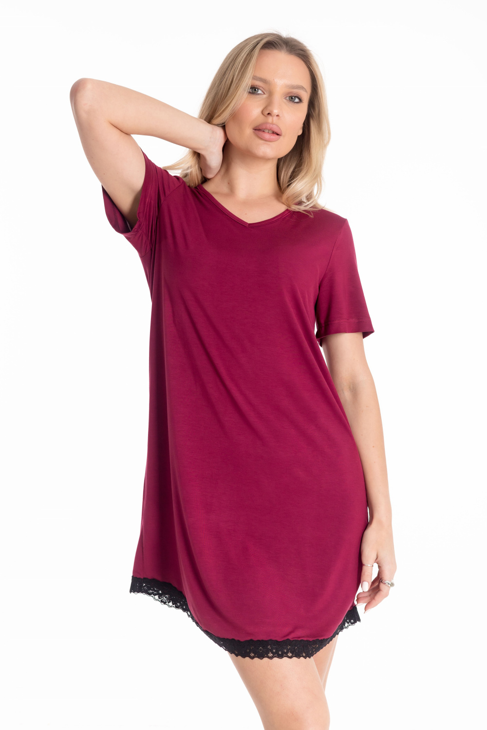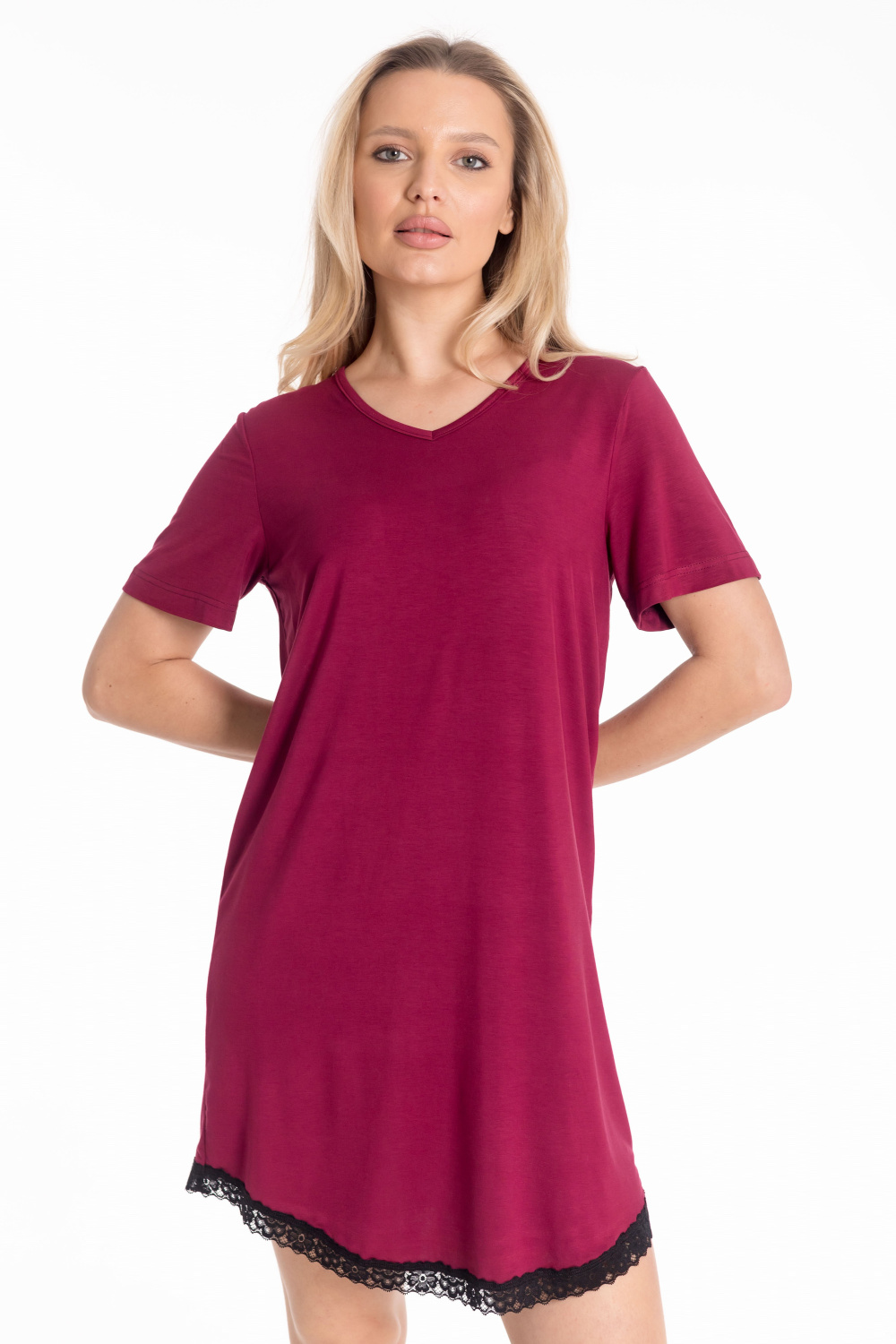 Женская сорочка с короткими рукавами выполнена из мягкой вискозы. Вырез горловины обработан бейкой, по низу изделия — изящное кружево. Лаконичный крой и лёгкая ткань обеспечивают комфорт и женственный вид.