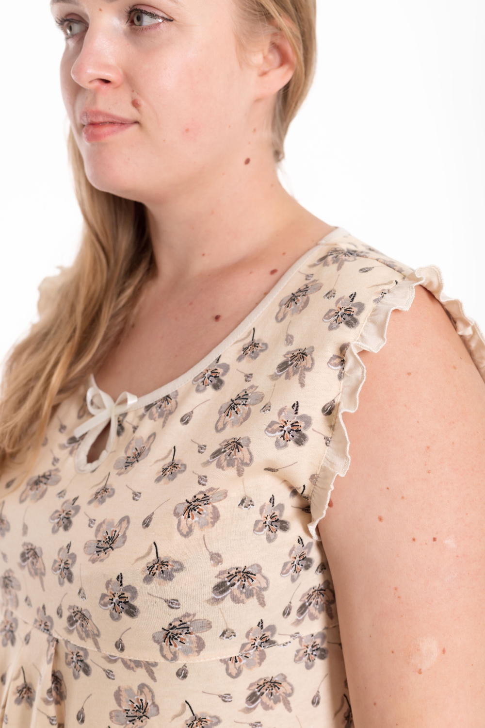 Сорочка женская выполнена из хлопкового полотна с набивным рисунком. Романтическое настроение создают рюши по проймам и низу изделия. Фигурная горловина обработана бейкой, спереди в качестве декора использован бант из атласной ленты.