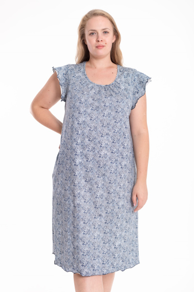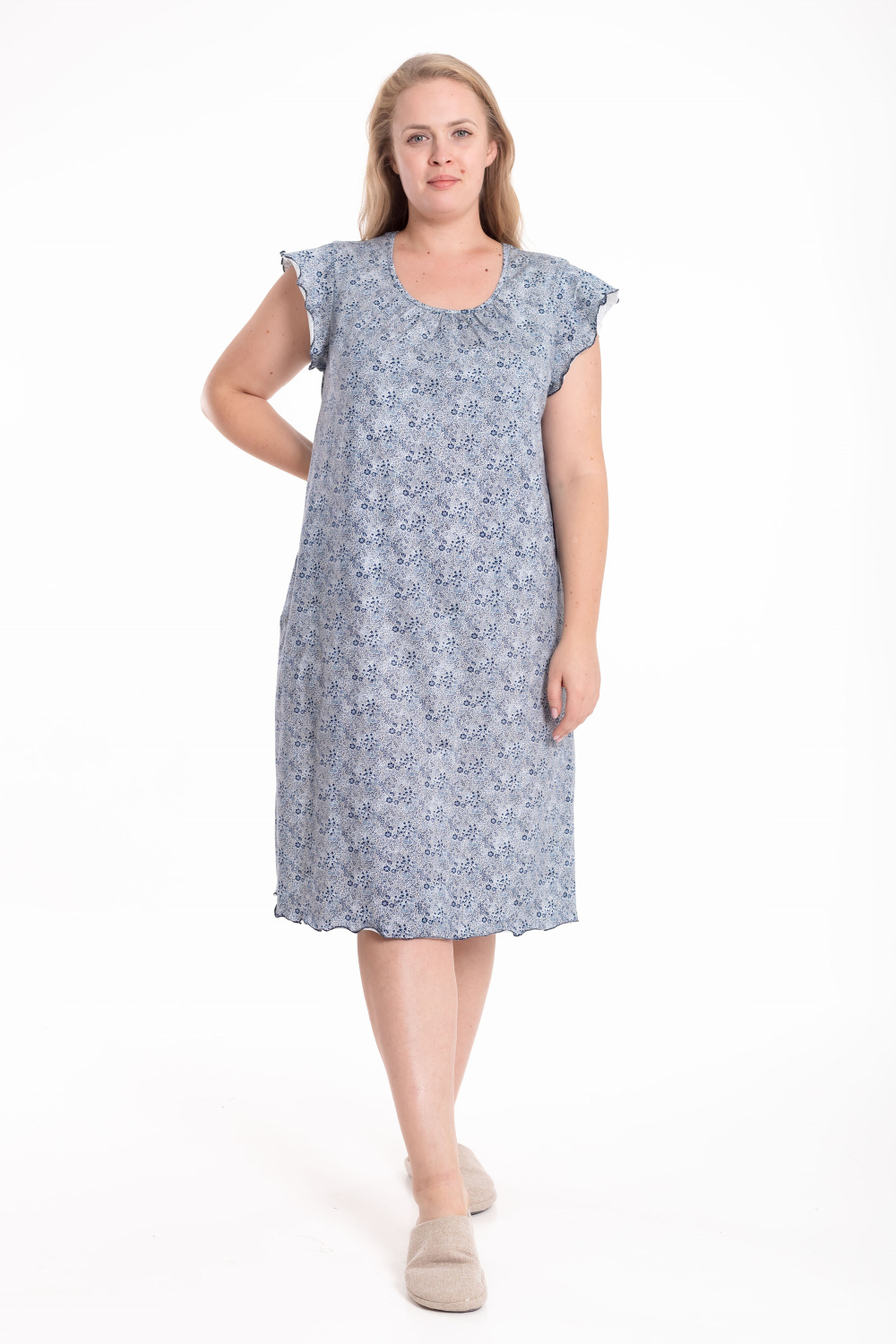 Женская сорочка выполнена из хлопкового полотна с набивным рисунком. Горловина оформлена бейкой из основного полотна. Низ рукавов и изделия обметаны декоративным стежком "пике".