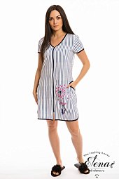 Сорочка женская выполнена из х/б полотна с набивкой. Свободу силуэту придают складки спереди. Низ рукавов и верхний срез кокетки обработаны кружевом. Пройма и росток обработаны бейкой из основного полотна.