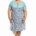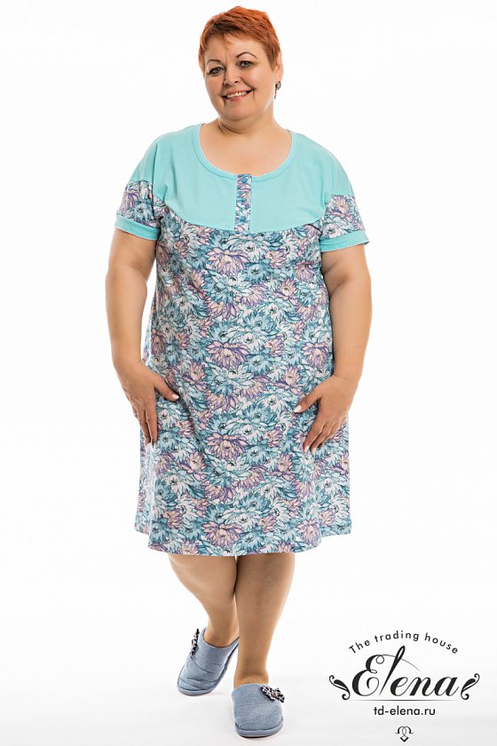 Сорочка женская выполнена из натурального хлопкового полотна. Линия плеча спущена, спереди и на спинке расположены кокетки из однотонного полотна. Вырез горловины круглый, с планкой с застежкой на пуговицы. По горловине и низу манжет отделочная строчка "креш".
