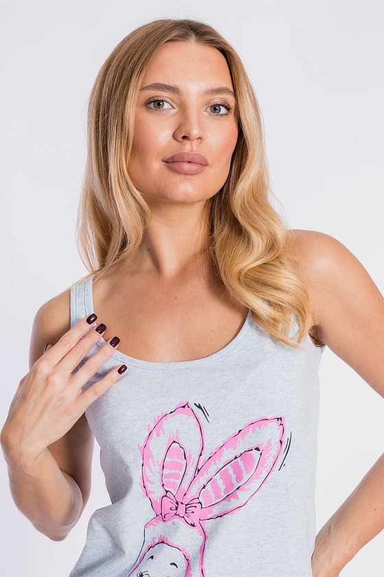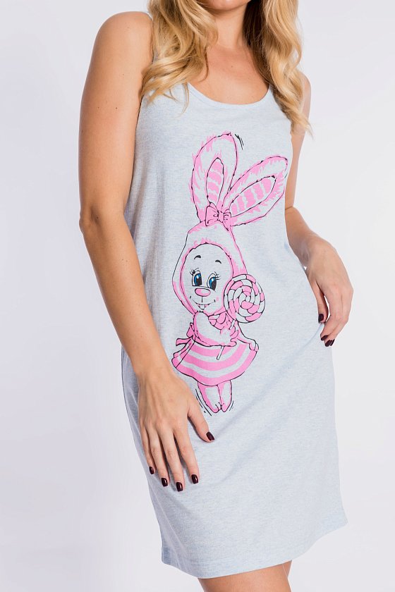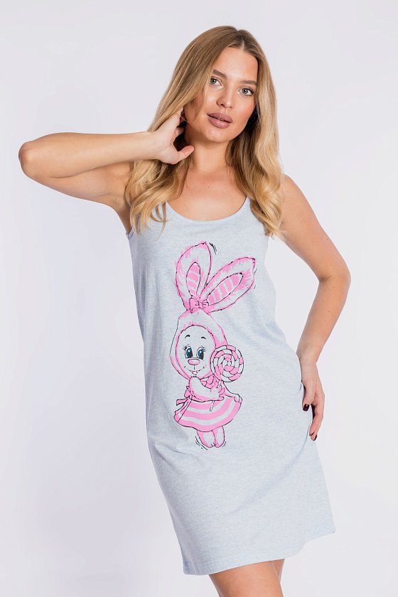 Сорочка выполнена из однотонной хлопковой ткани. Силуэт свободный, горловина имеет круглый вырез. Спереди расположен оригинальный принт.