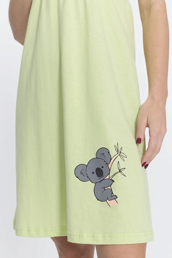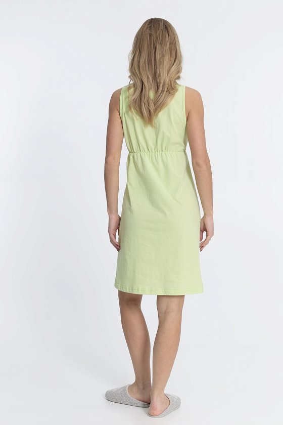 Без рукавов, отрезная под грудью юбка. Передняя часть лифа с запахом и сборкой под грудью. По линии притачивания юбки расположена мягкая резинка. На передней части принт.