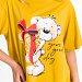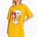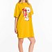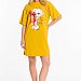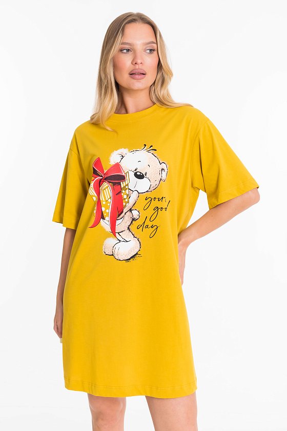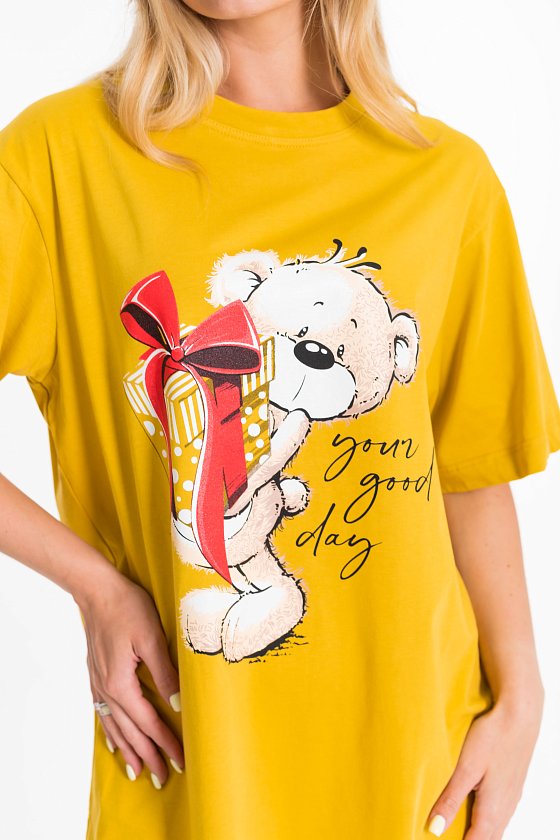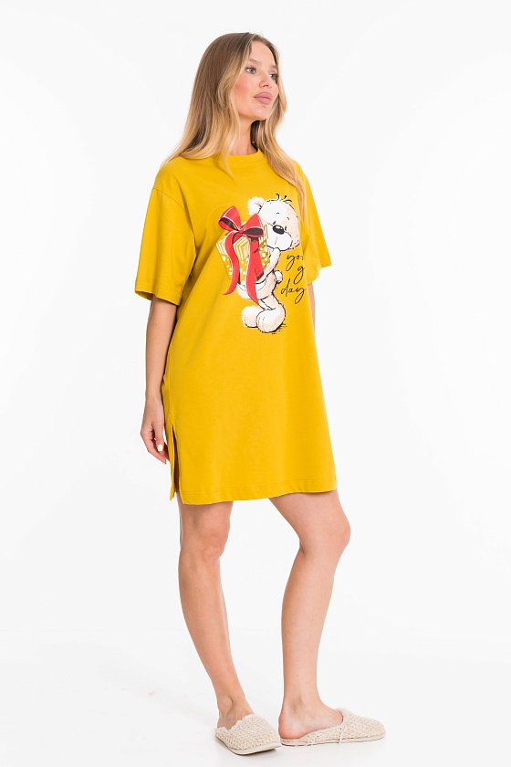 Сорочка по типу удлиненной футболки оверсайз из однотонной кулирки. Рукав короткий, на полочке принт, внизу правого бокового шве разрез.