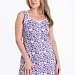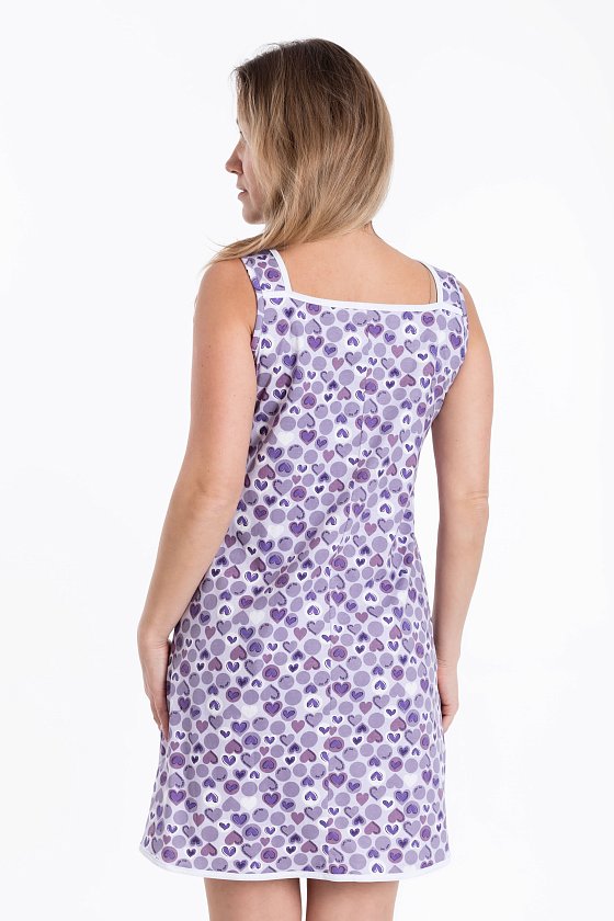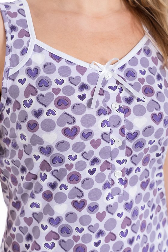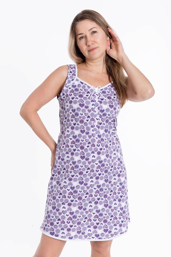 Женская сорочка выполнена из х/б полотна с набивкой. Спереди застежка на пуговицах и декоративный бантик. Проймы, низ изделия и горловина обработаны бейкой.