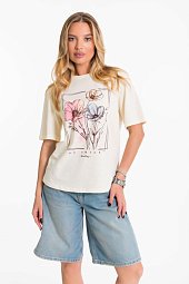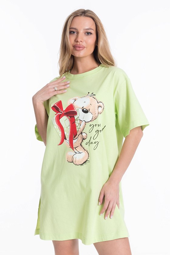 Женская сорочка — отличный выбор для создания повседневного образа. Она выполнена из мягкой и лёгкой ткани — кулирки, которая обеспечивает комфорт при носке. Благодаря свободному крою оверсайз и короткому рукаву сорочка не сковывает движений. Принт на полочке и боковой разрез придают изделию стильный вид.