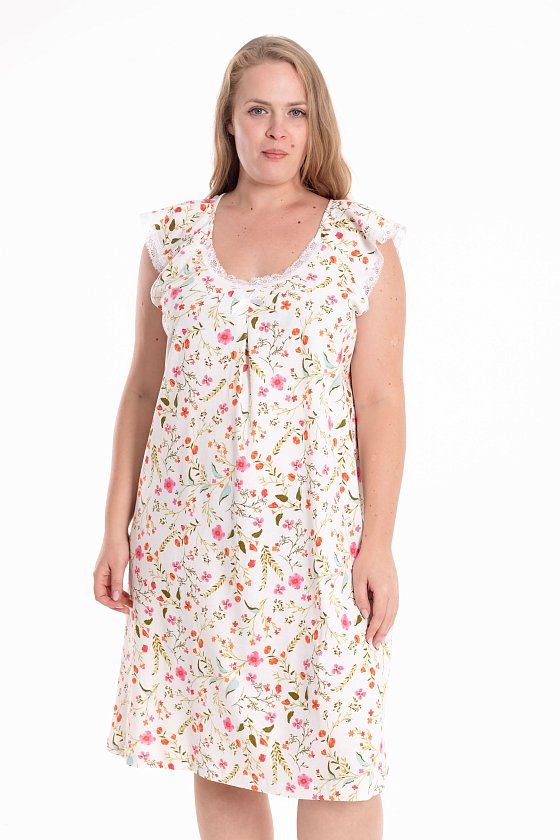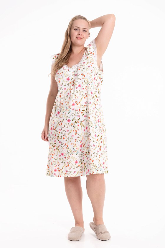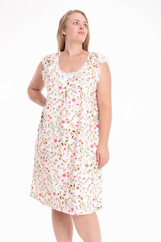 Женская сорочка из мягкой рибаны с нежной набивкой. Свободу силуэту придают изящные складки по центру. Модель украшена кружевом по низу рукавов и верхнему срезу кокетки. Завершает образ элегантный бантик спереди.