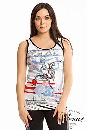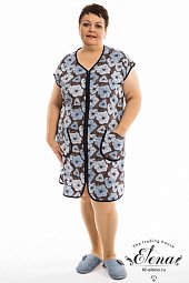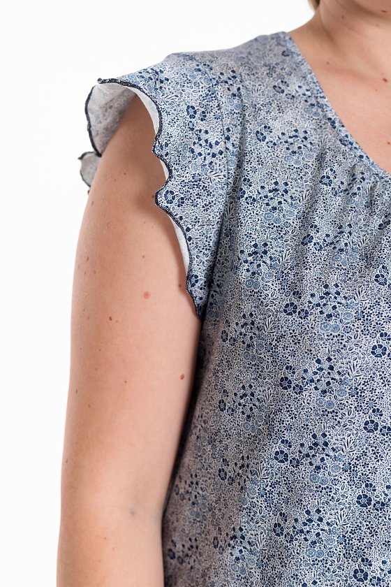 Женская сорочка выполнена из хлопкового полотна с набивным рисунком. Горловина оформлена бейкой из основного полотна. Низ рукавов и изделия обметаны декоративным стежком "пике".