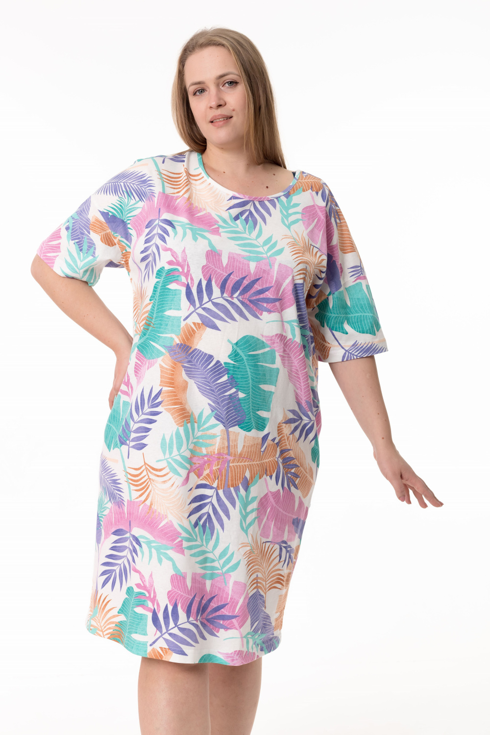Сорочка выполненная из кулирки — женственная модель для комфортного отдыха. Модель свободного кроя, объёмная в верхней части и плавно зауженная к низу, с коротким спущенным рукавом. Горловина овальной формы аккуратно обработана контрастной бейкой. Длина сорочки до уровня колен создает удобный и лаконичный силуэт.