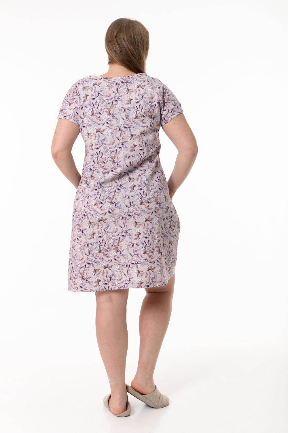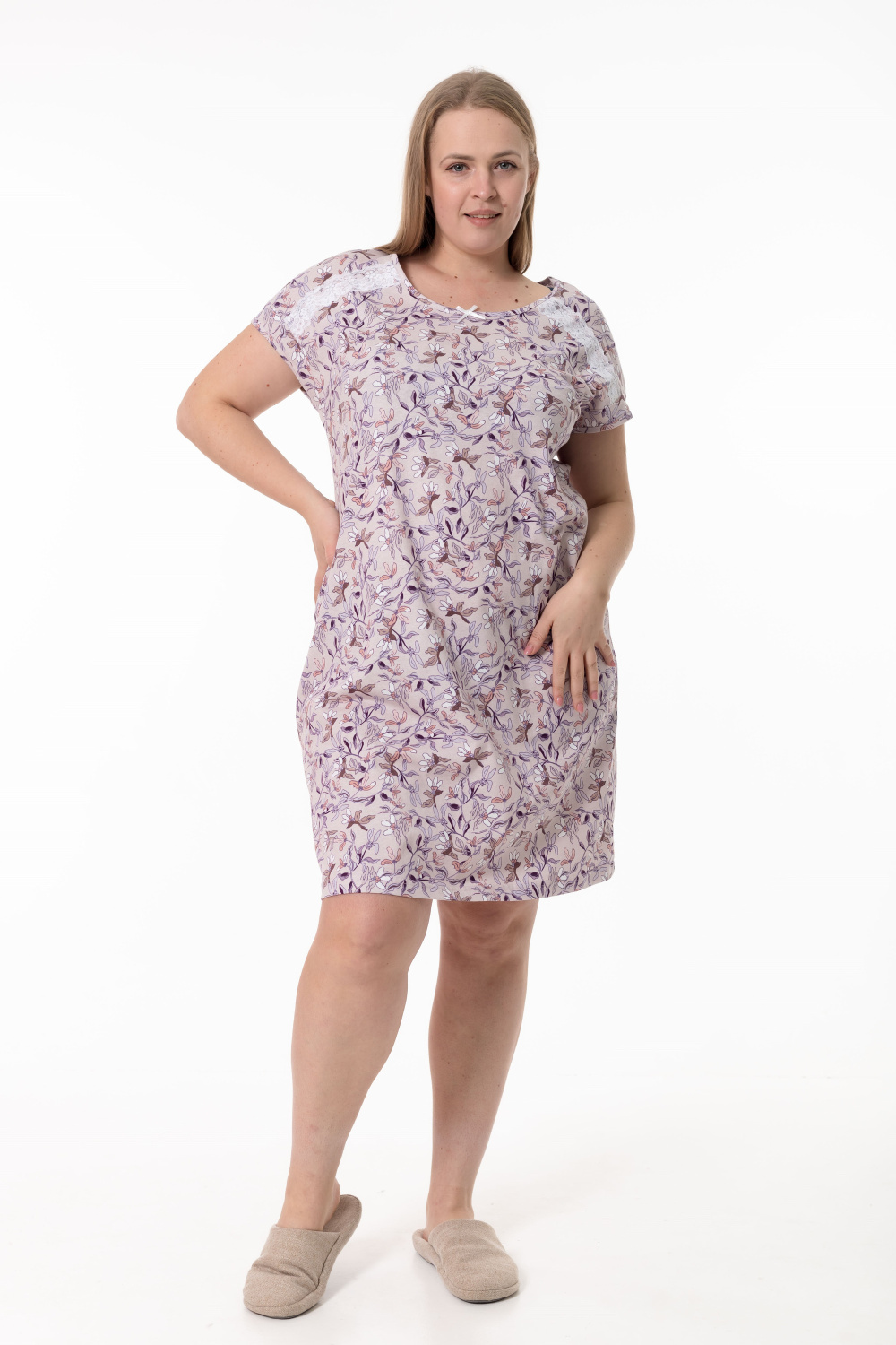 Сорочка выполнена из х/б полотна с набивным рисунком. Линия плеча спущенная, срезы горловины и пройм обшиты бейкой. Спереди сорочка украшена декоративным бантиком и кружевом.