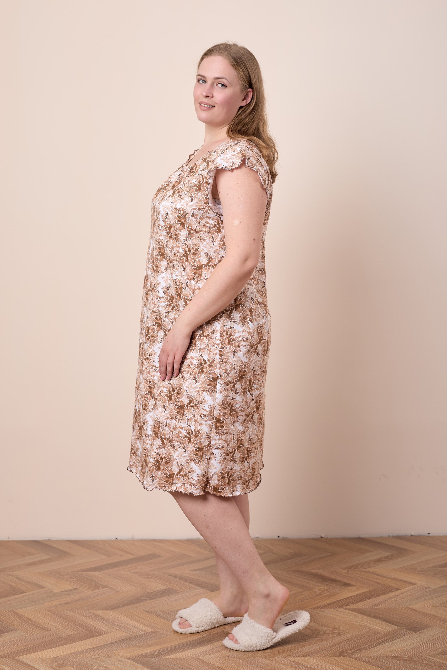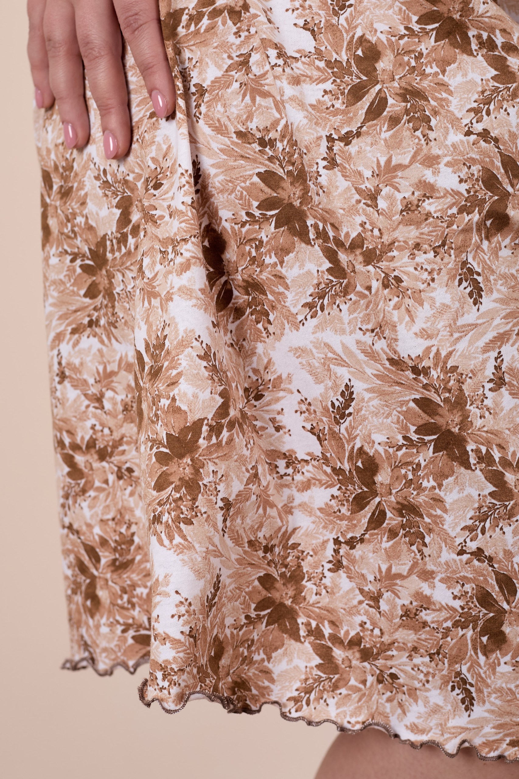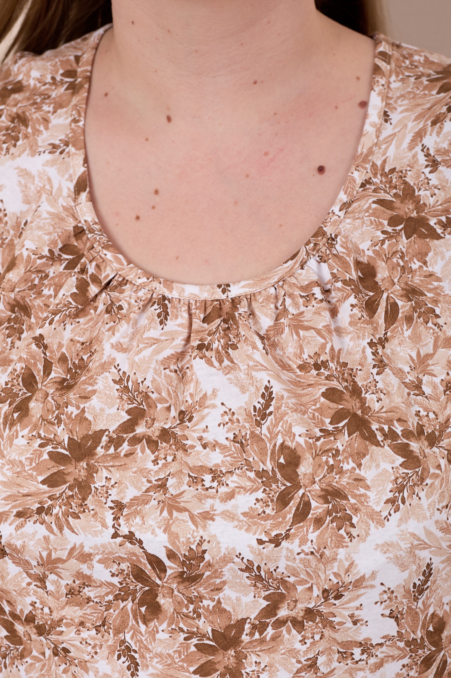 Женская сорочка выполнена из хлопкового полотна с набивным рисунком. Горловина оформлена бейкой из основного полотна. Низ рукавов и изделия обметаны декоративным стежком "пике".