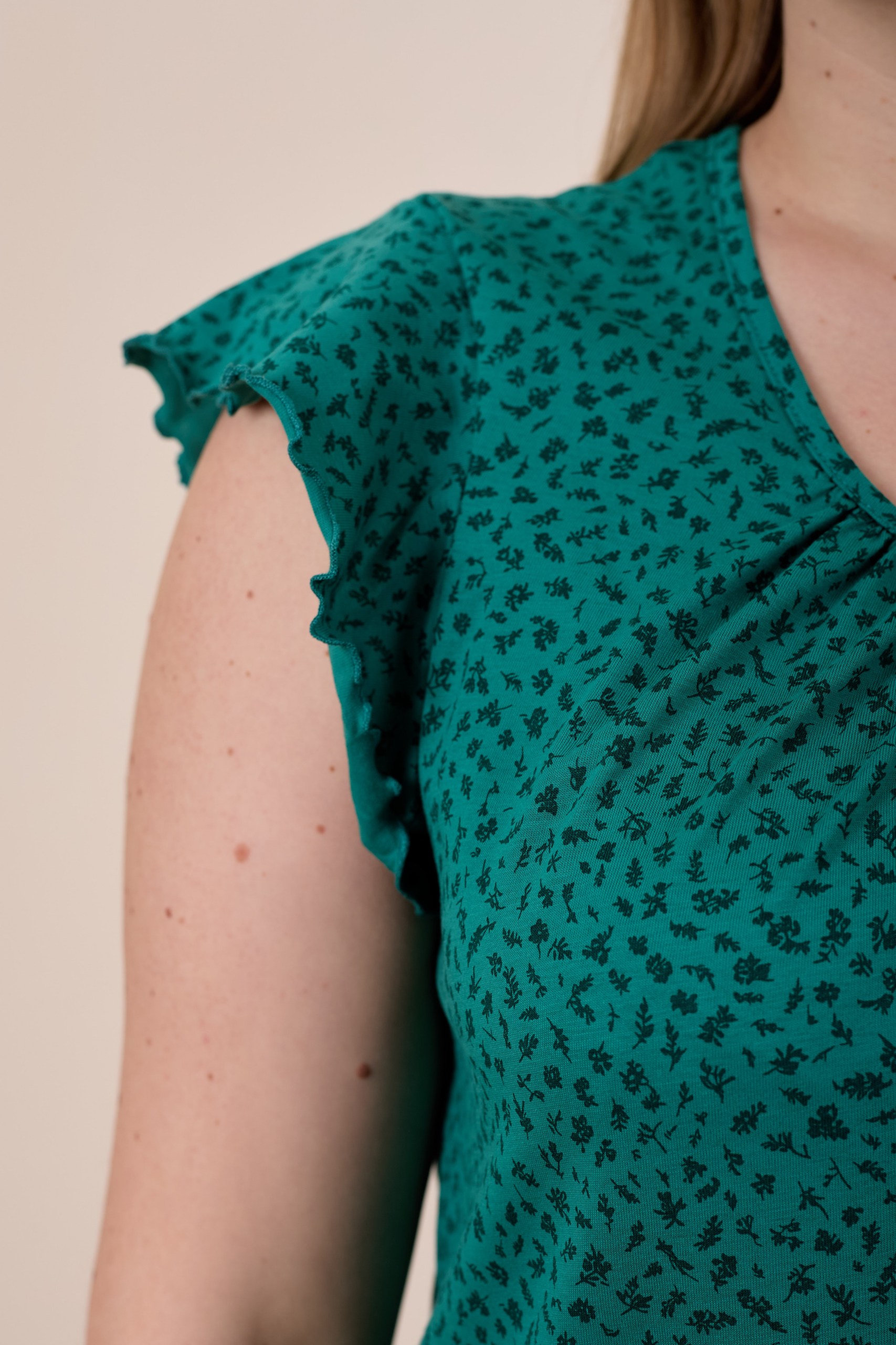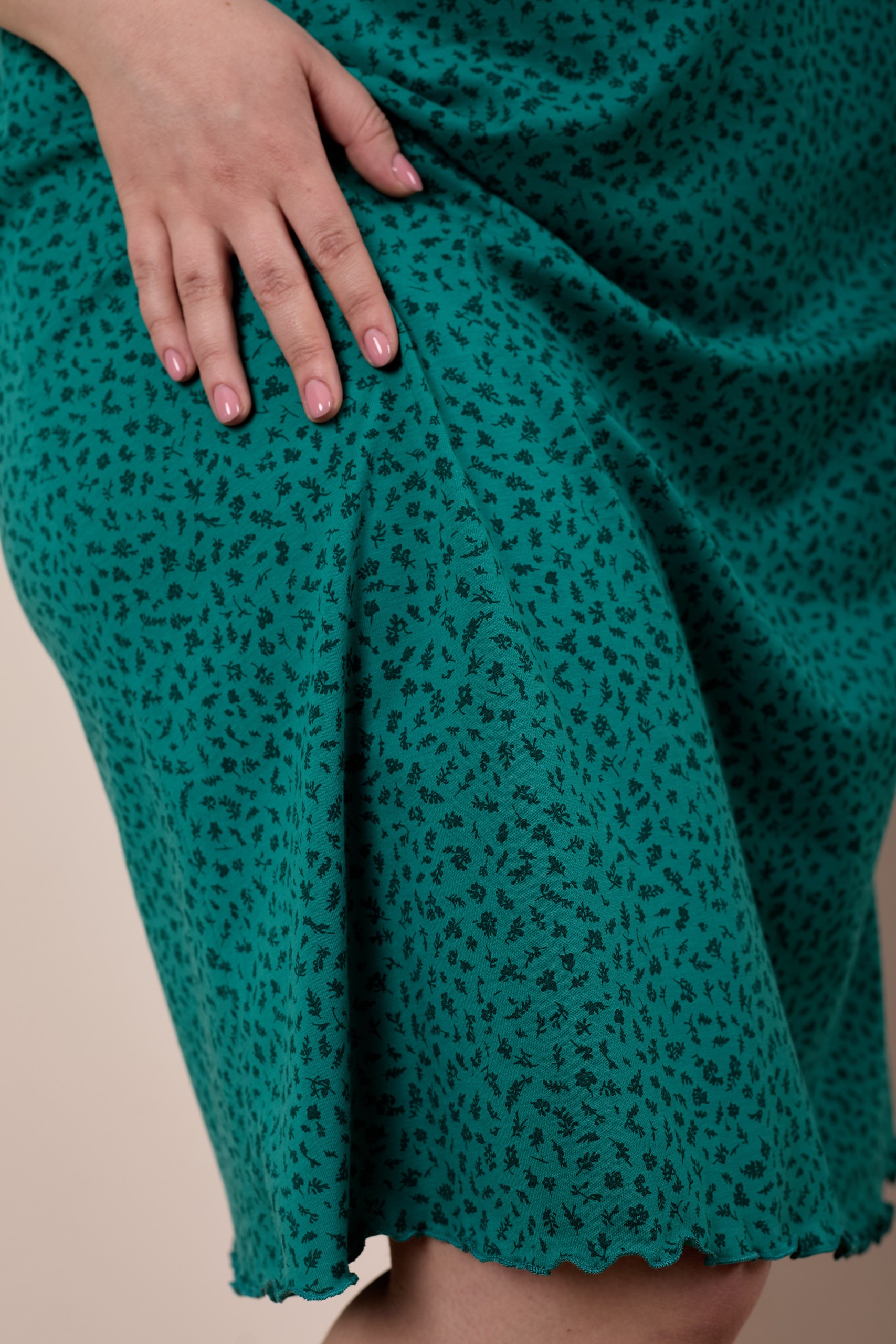 Женская сорочка выполнена из хлопкового полотна с набивным рисунком. Горловина оформлена бейкой из основного полотна. Низ рукавов и изделия обметаны декоративным стежком "пике".