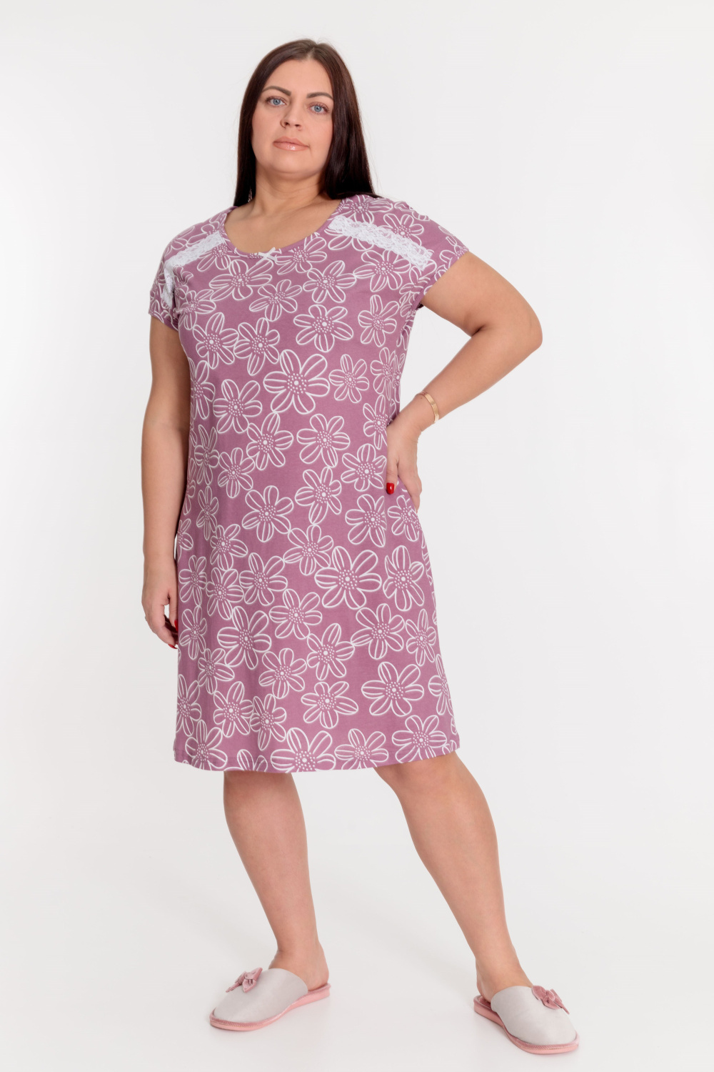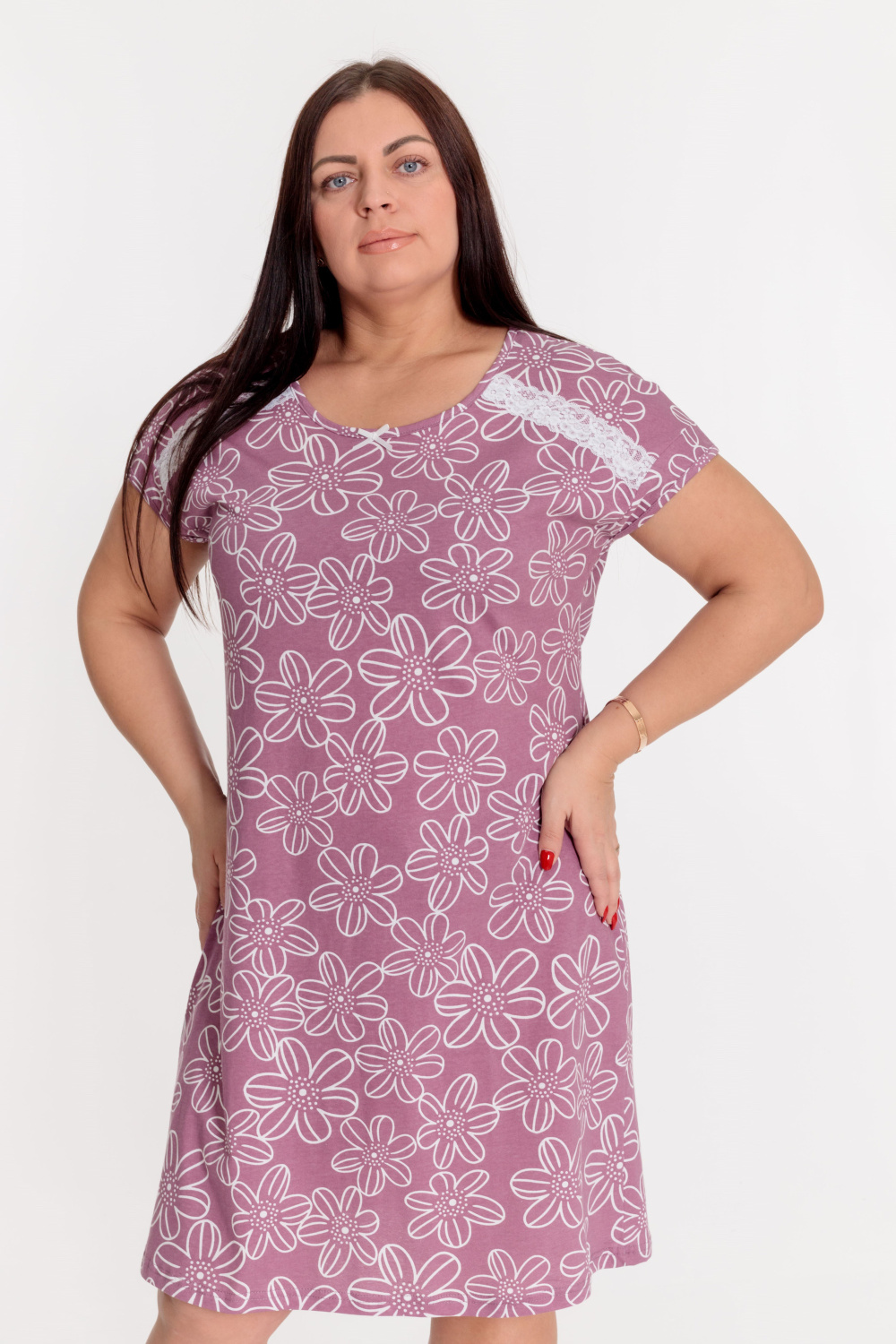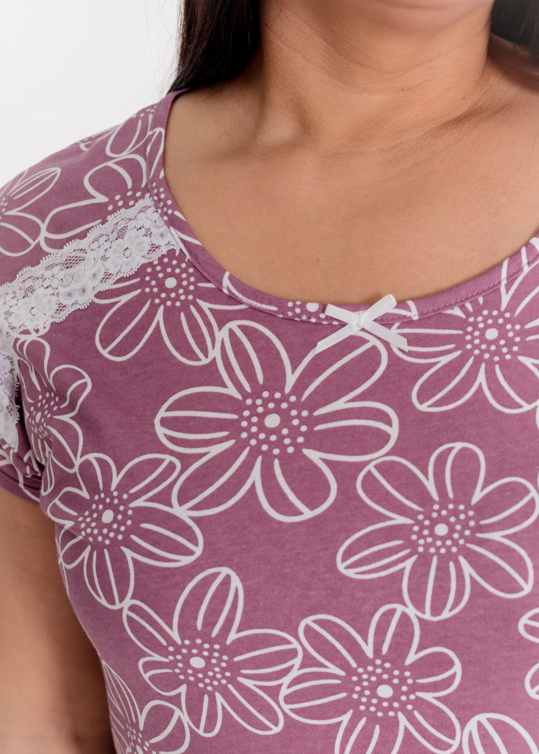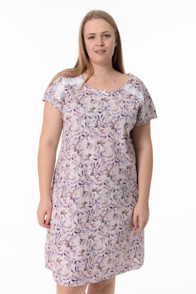 Сорочка выполнена из х/б полотна с набивным рисунком. Линия плеча спущенная, срезы горловины и пройм обшиты бейкой. Спереди сорочка украшена декоративным бантиком и кружевом.