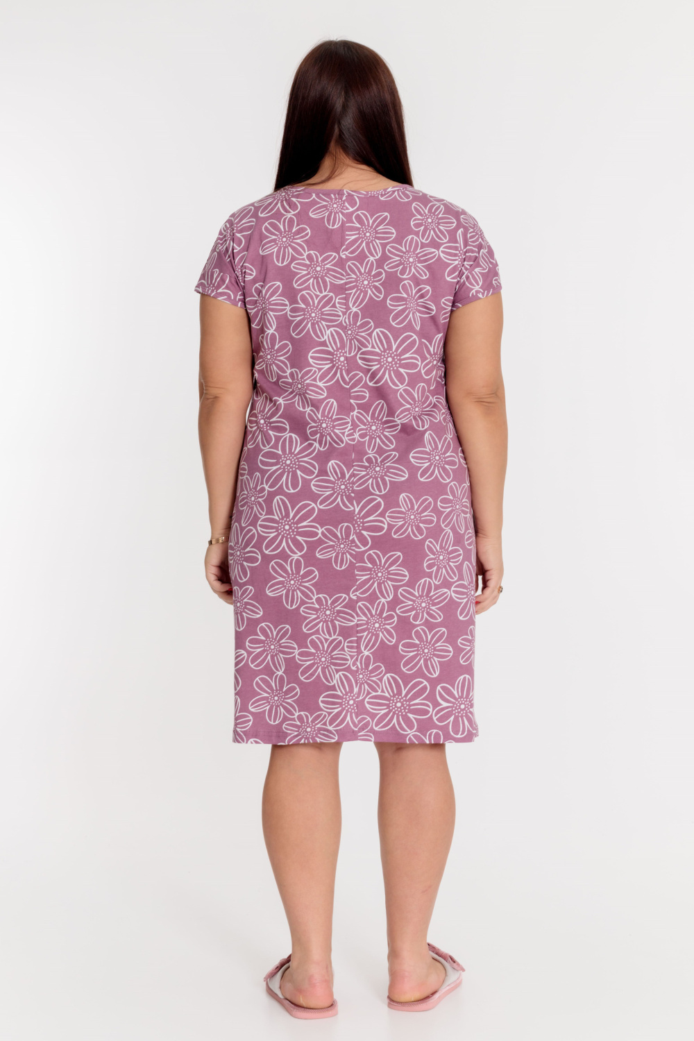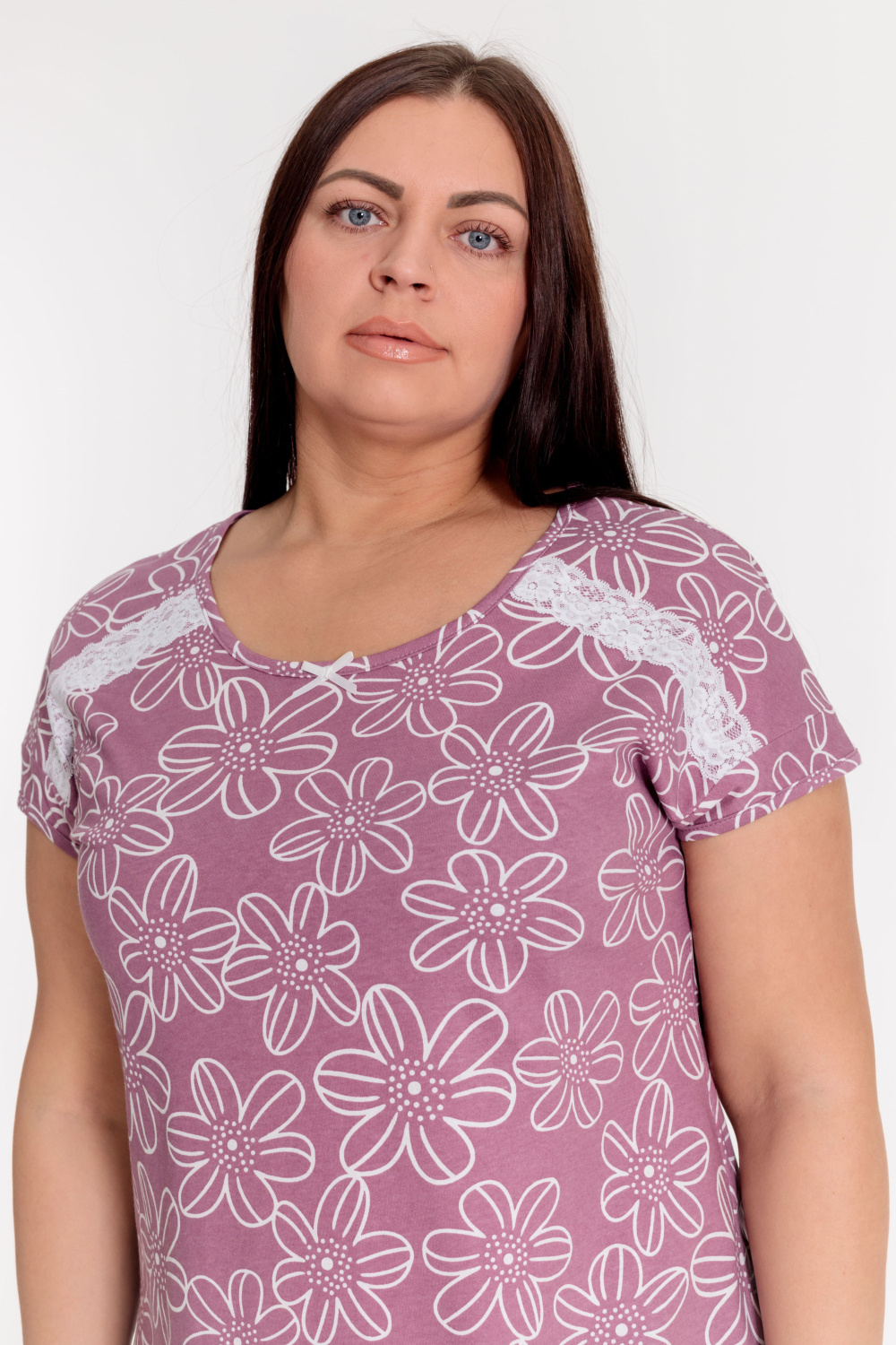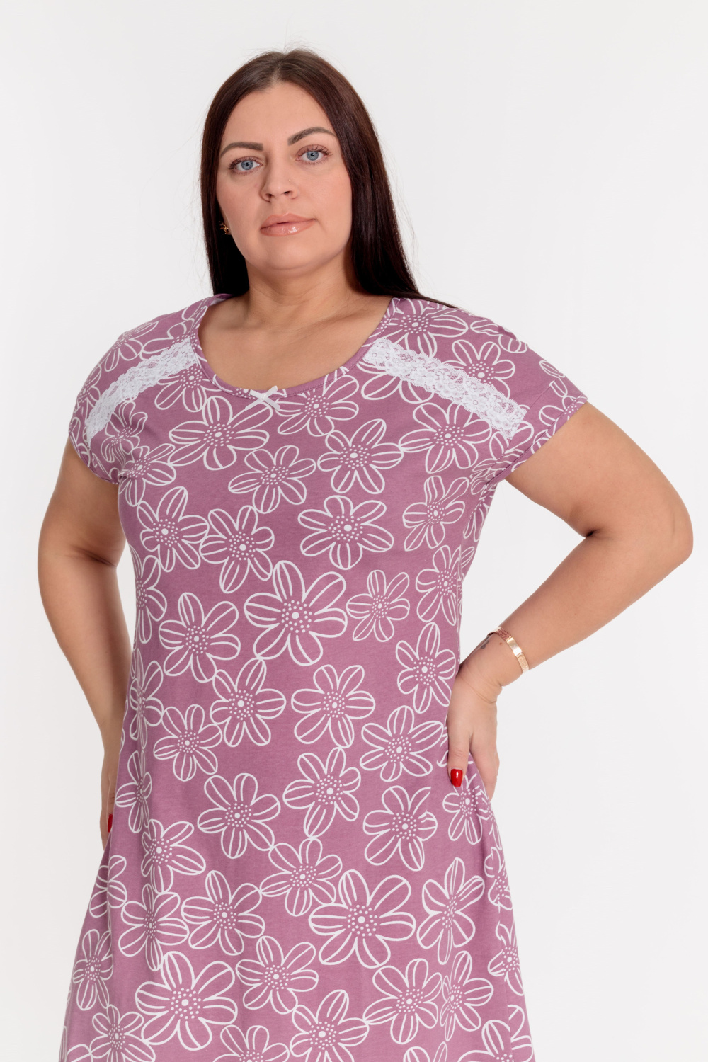 Сорочка выполнена из х/б полотна с набивным рисунком. Линия плеча спущенная, срезы горловины и пройм обшиты бейкой. Спереди сорочка украшена декоративным бантиком и кружевом.