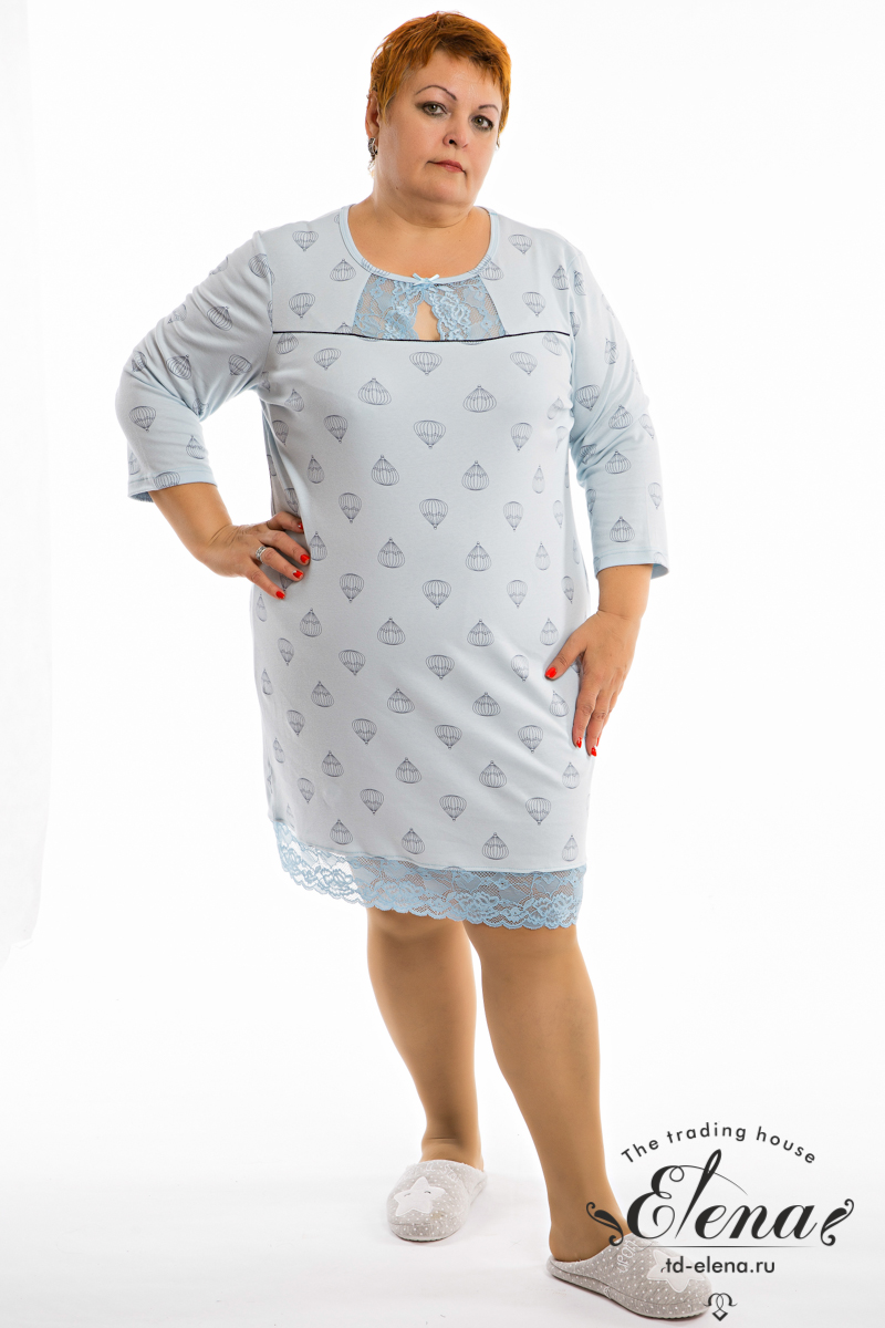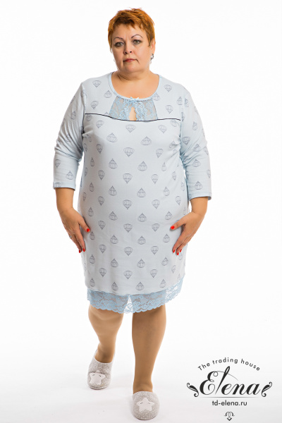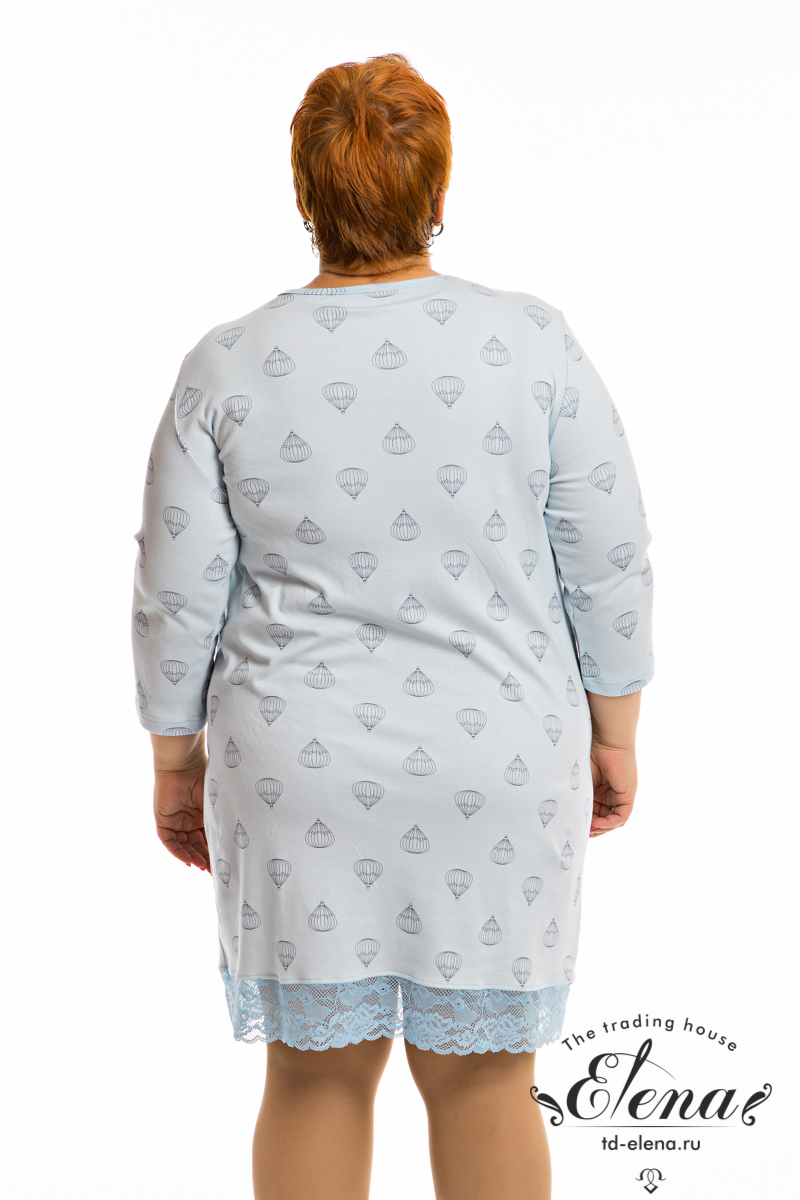 Сорочка из интерлока с отделкой кружевом на кокетке и по низу. Круглый вырез горловины украшен бантиком. По линии притачивания кокетки вставлен кант в цвет набивки. Рукава длиной 3/4.