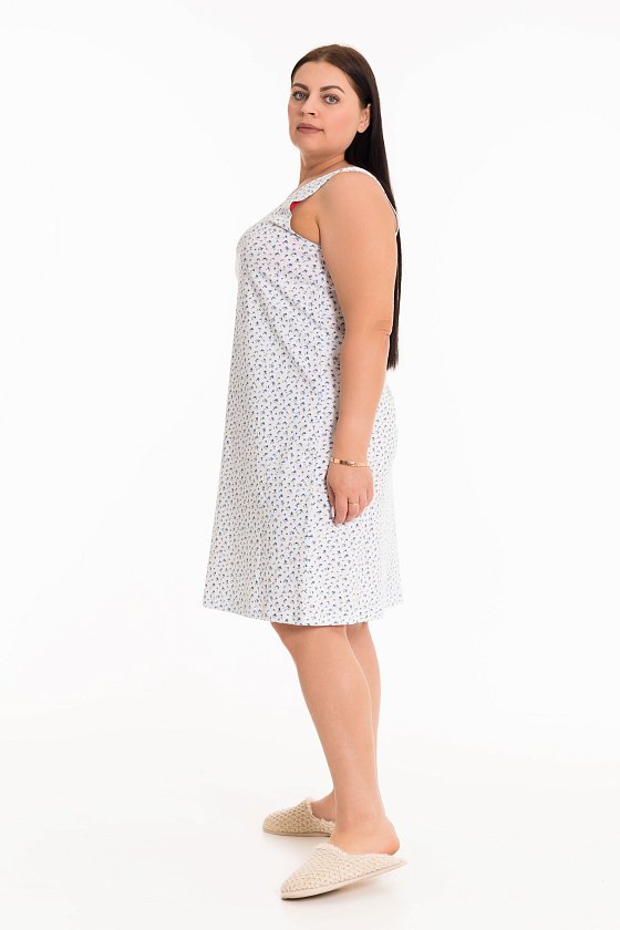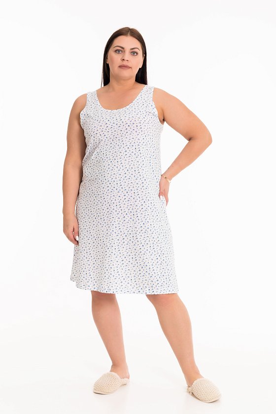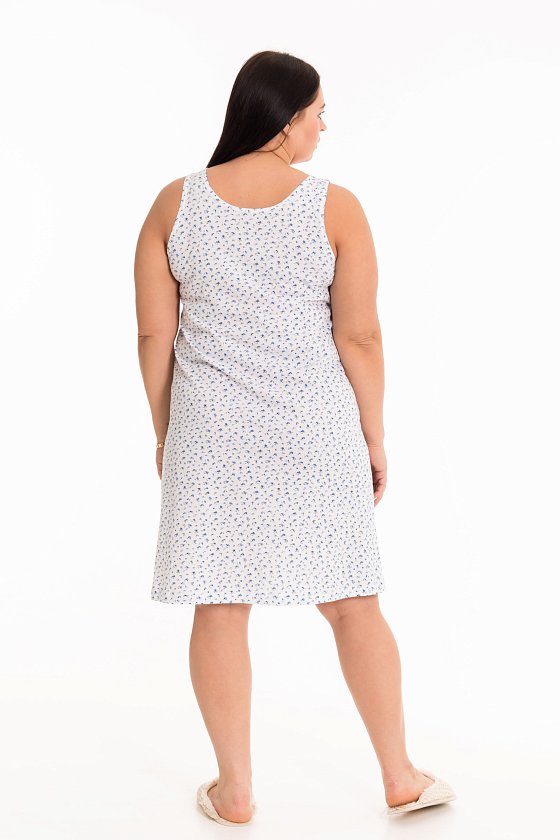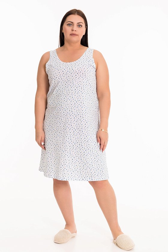 Сорочка выполнена из набивной хлопковой ткани. Покрой свободный, широкие бретели, вырез горловины круглый.