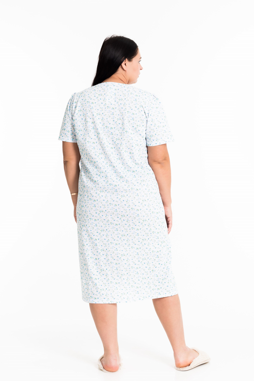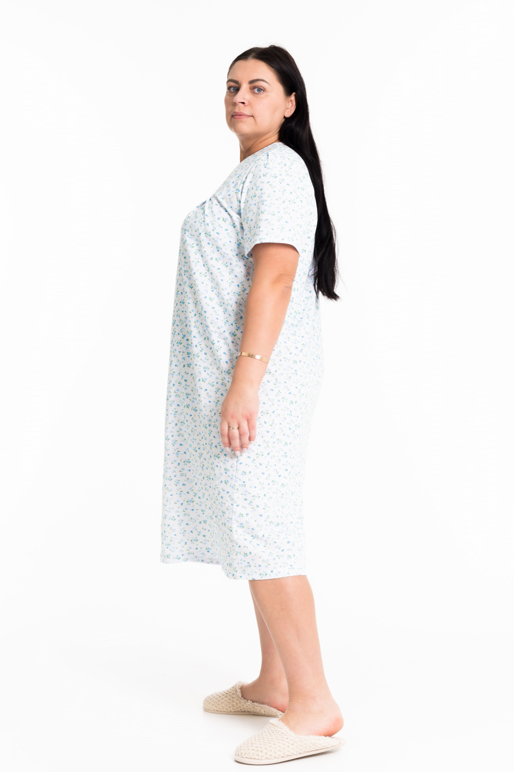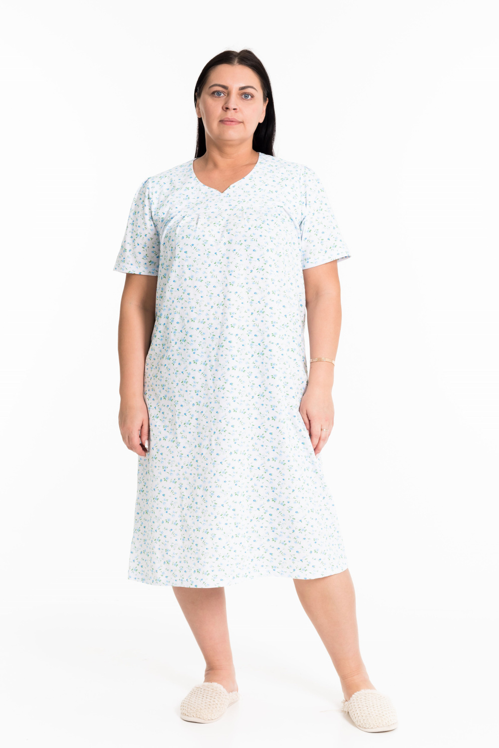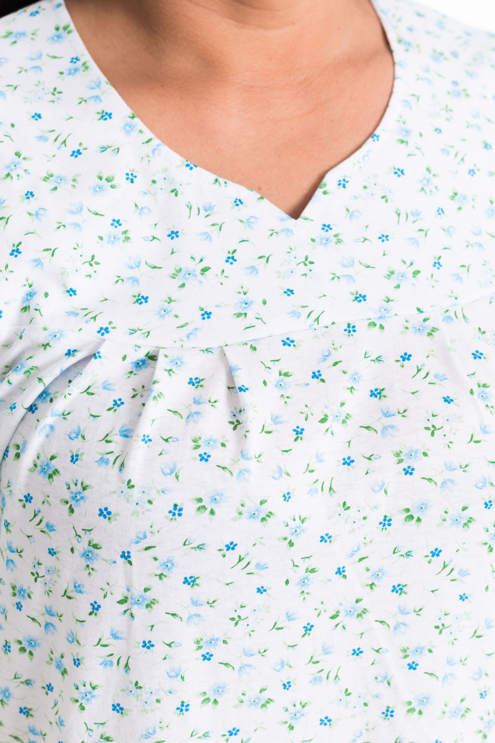 Сорочка свободного покроя выполнена из хлопковой ткани. Рукав длиной выше локтя, на круглой горловине декоративный вырез в форме галки.