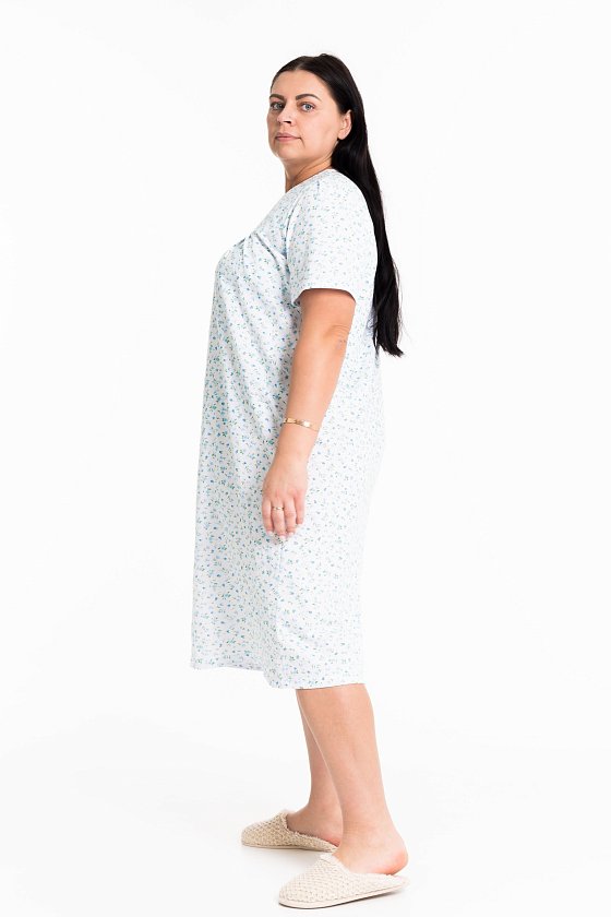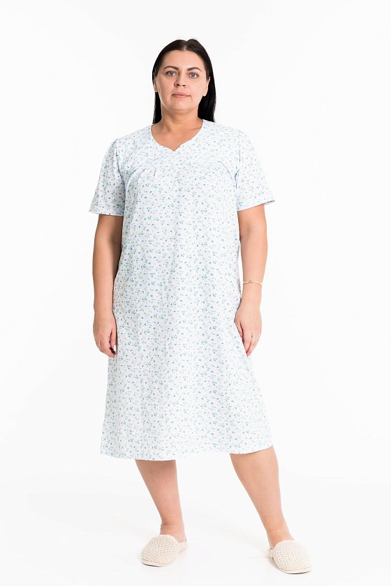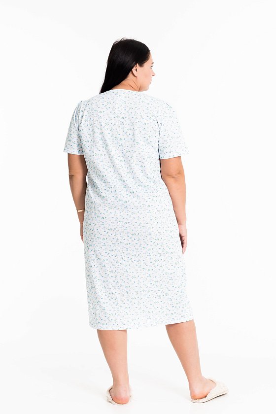 Сорочка свободного покроя выполнена из хлопковой ткани. Рукав длиной выше локтя, на круглой горловине декоративный вырез в форме галки.