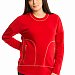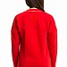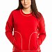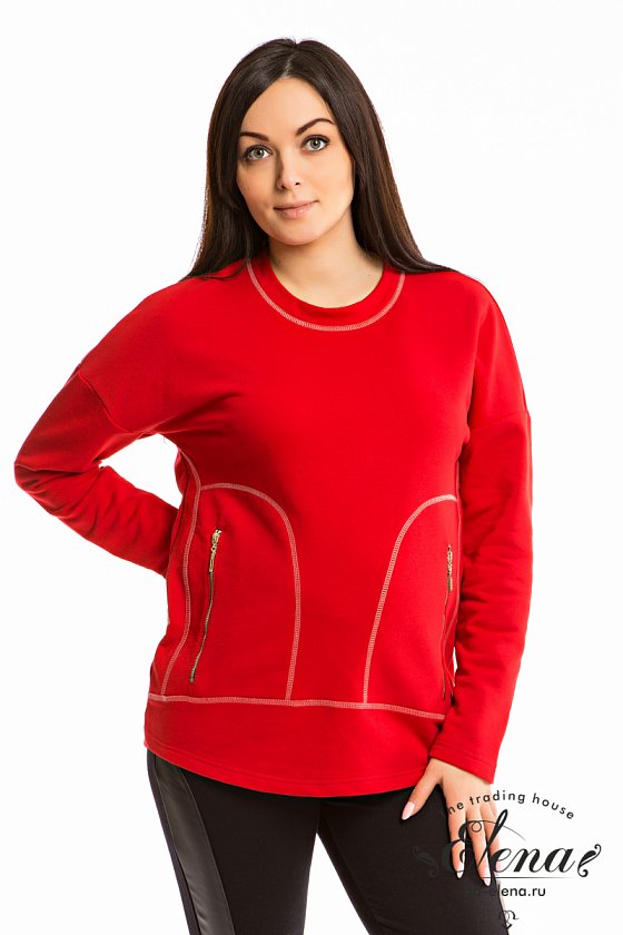 Толстовка выполнена из однотонного футера трёхнитки (воздушка) в красном цвете. Горловина с круглым вырезом, рукава длинные, со спущенным плечом. Спереди размещены карманы с металлическими молниями. На спинке расположена вышивка.