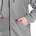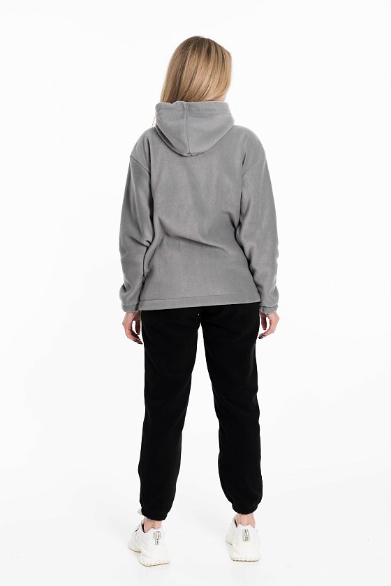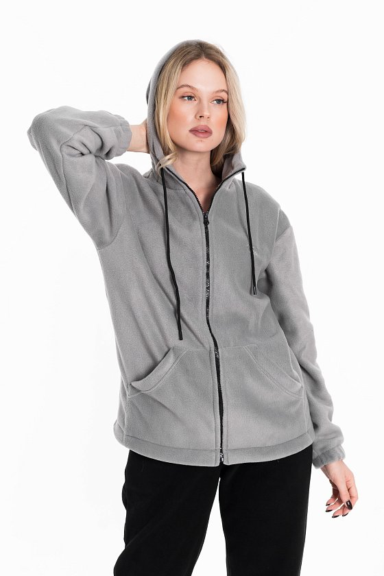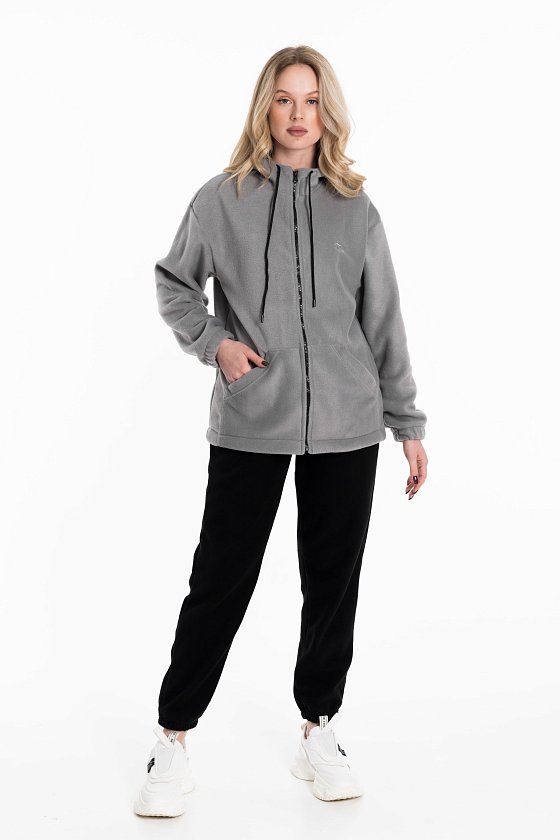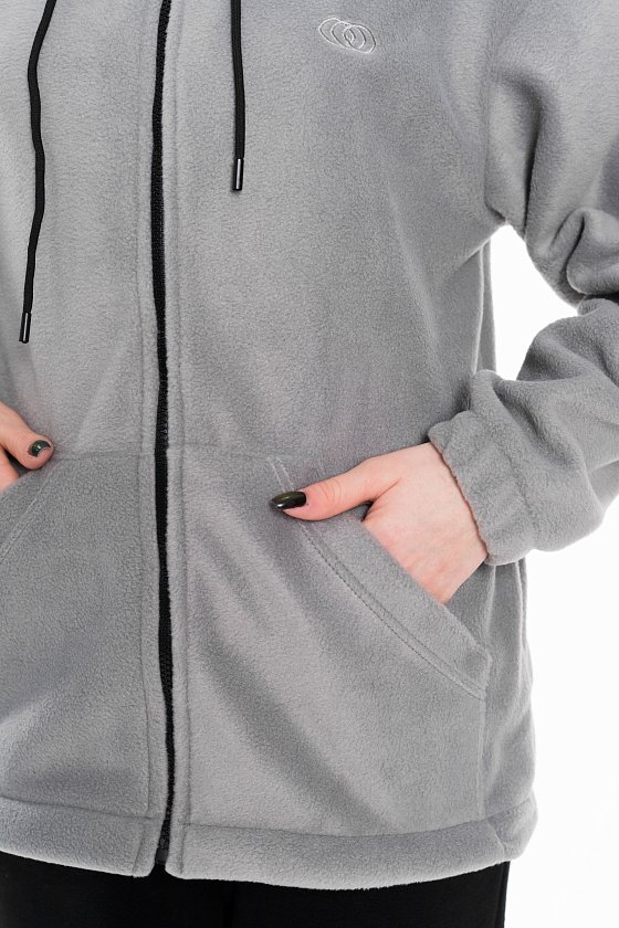 Женская толстовка свободного кроя — отличный выбор для повседневной носки. Она изготовлена из мягкого и тёплого однотонного темно-серого флиса, который обеспечивает комфорт в прохладную погоду. Толстовка имеет воротник-стойку, удобный капюшон и рукава на манжете с резинкой для защиты от ветра. Центральная застёжка на молнию и шнур в капюшоне выполнены в черном цвете, что придает изделию оригинальность. В накладные карманы удобно поместить необходимые мелочи. На передней части толстовки расположена вышивка. Эта толстовка идеально подойдёт для прогулок, активного отдыха или домашней носки. Она выполнена из качественного материала, который сохраняет форму и цвет после стирки, не скатывается.