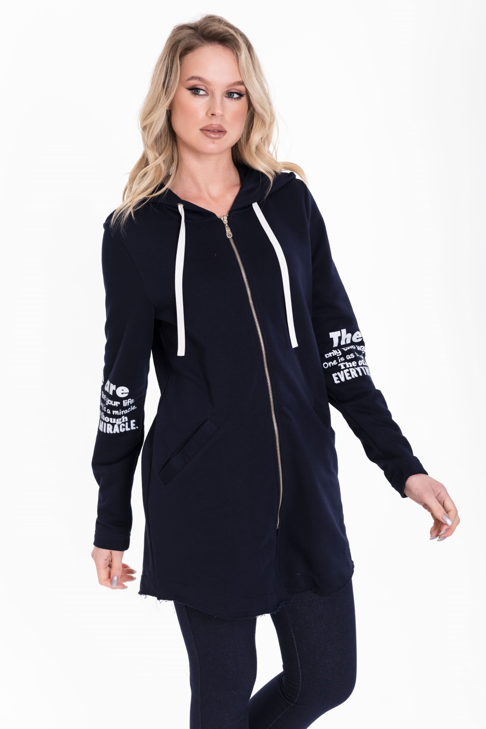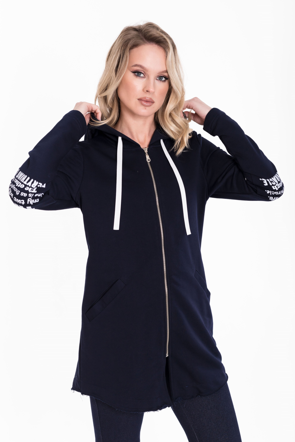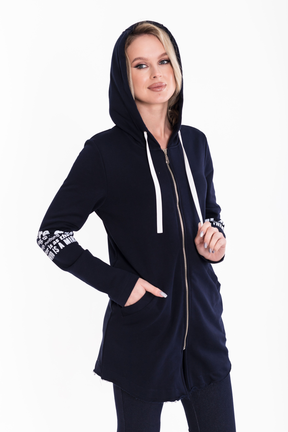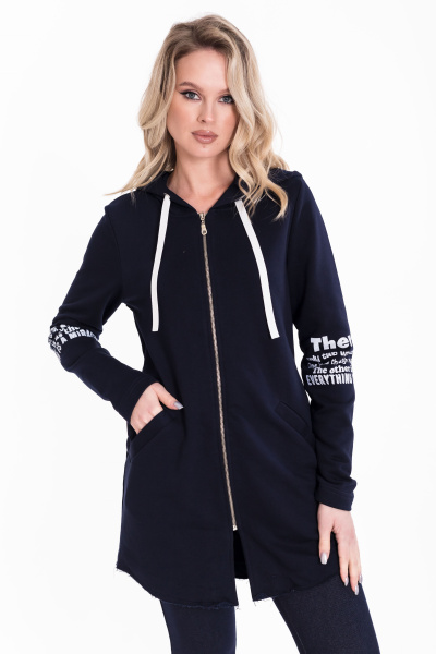 Кардиган с застёжкой на молнию выполнен из однотонного футера трёхнитки (воздушка). С длинным втачным рукавом, с капюшоном и прорезными карманами спереди. Низ кардигана имеет необработанный вид. На рукавах и капюшоне принт. Сзади, в среднем шве разрез.