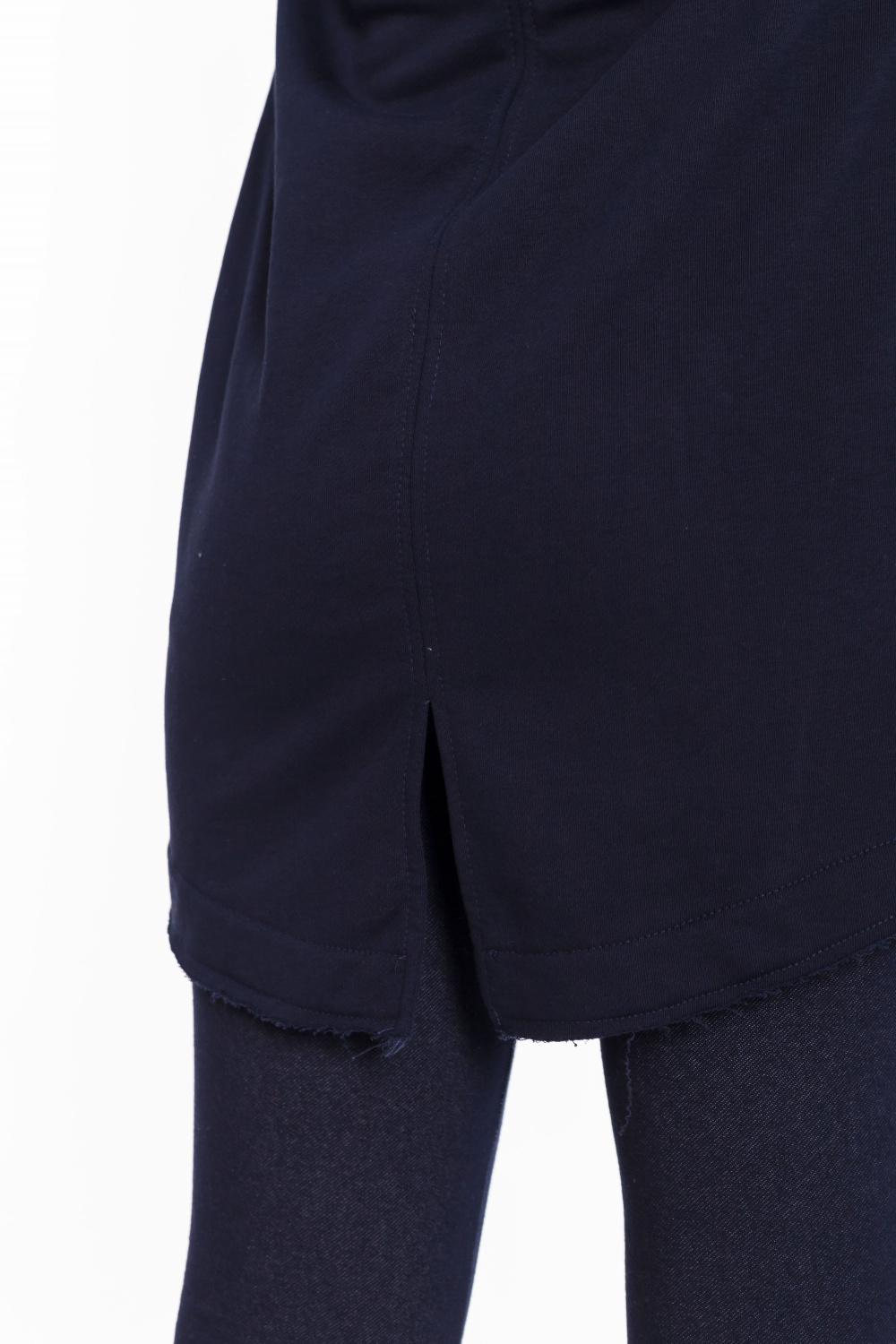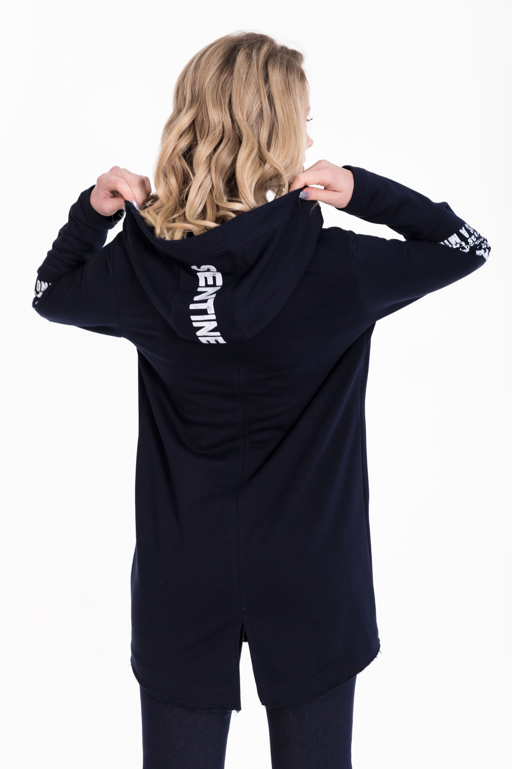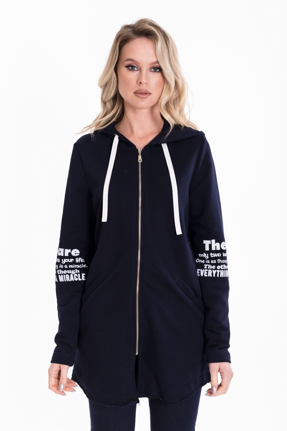 Кардиган с застёжкой на молнию выполнен из однотонного футера трёхнитки (воздушка). С длинным втачным рукавом, с капюшоном и прорезными карманами спереди. Низ кардигана имеет необработанный вид. На рукавах и капюшоне принт. Сзади, в среднем шве разрез.