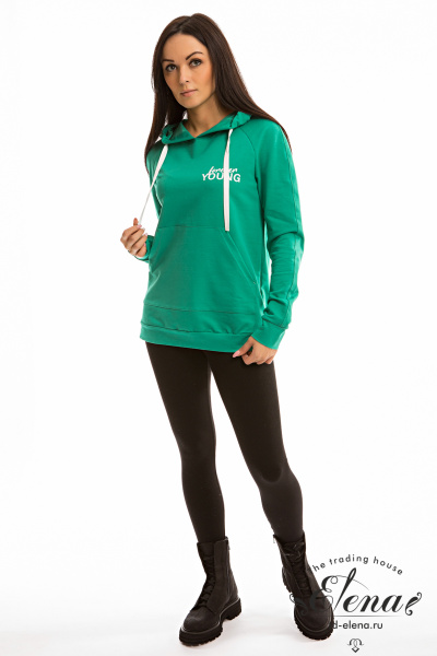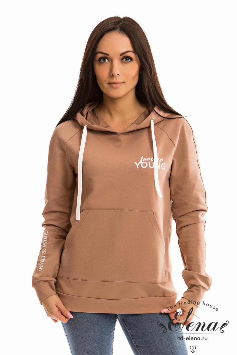 Женская толстовка с карманом-кенгуру выполнена из футер петли с лайкрой. Спереди и на правом рукаве нанесён принт, ширина капюшона регулируется шнуром.