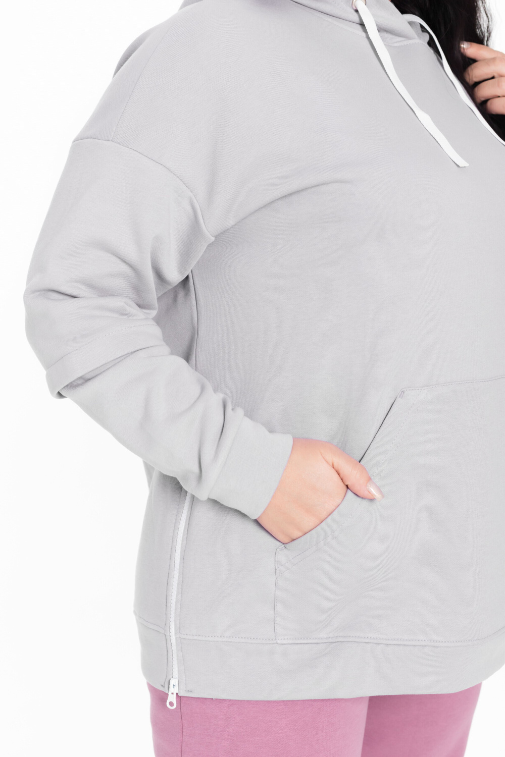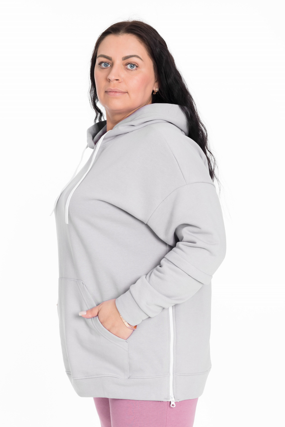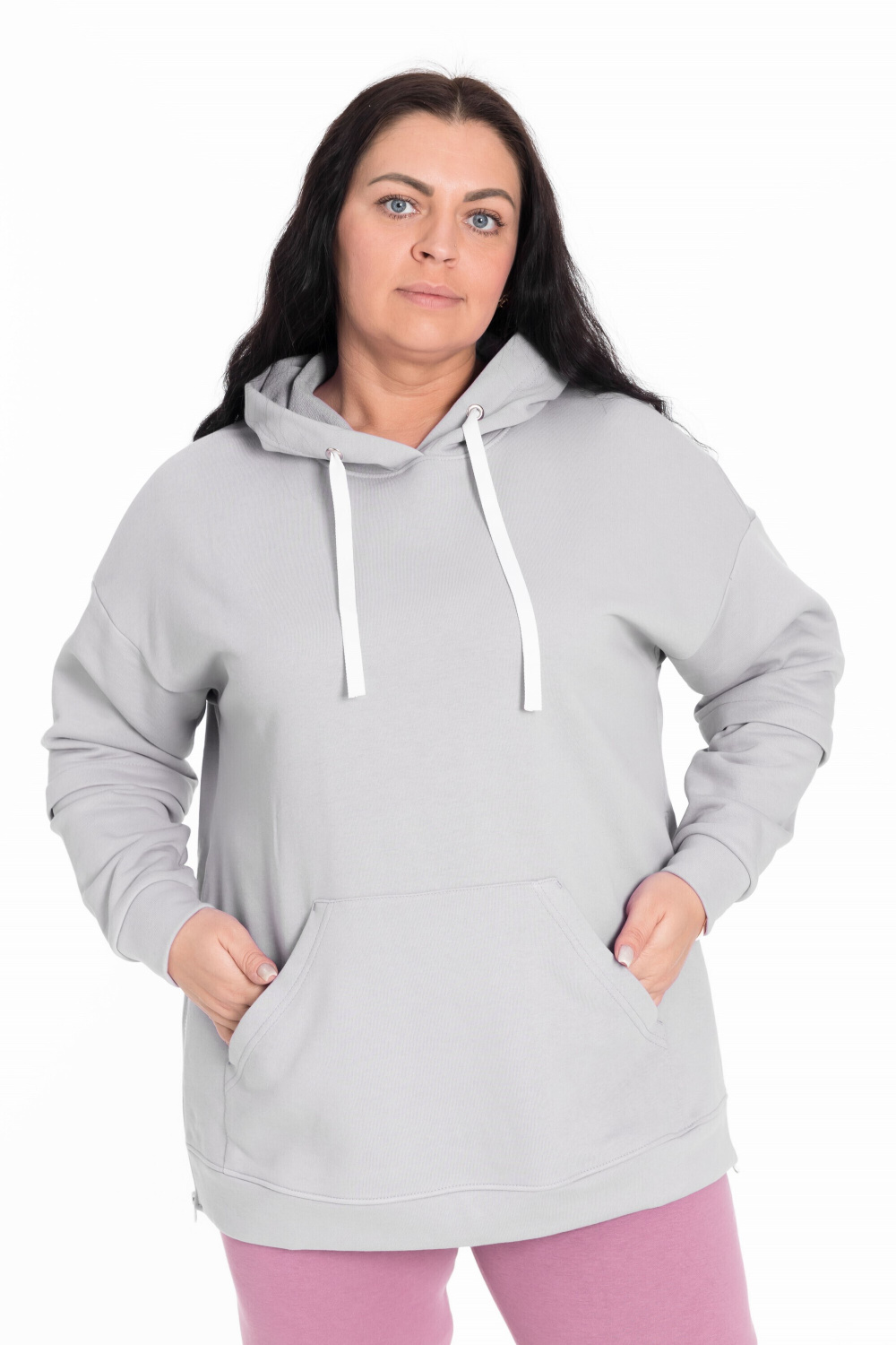 Женская толстовка из футера трёхнитка (воздушка). Силуэт толстовки свободный, ширина капюшона регулируется шнуром. В боковых разрезах вшиты молнии. Спереди располагается карман-кенгуру.