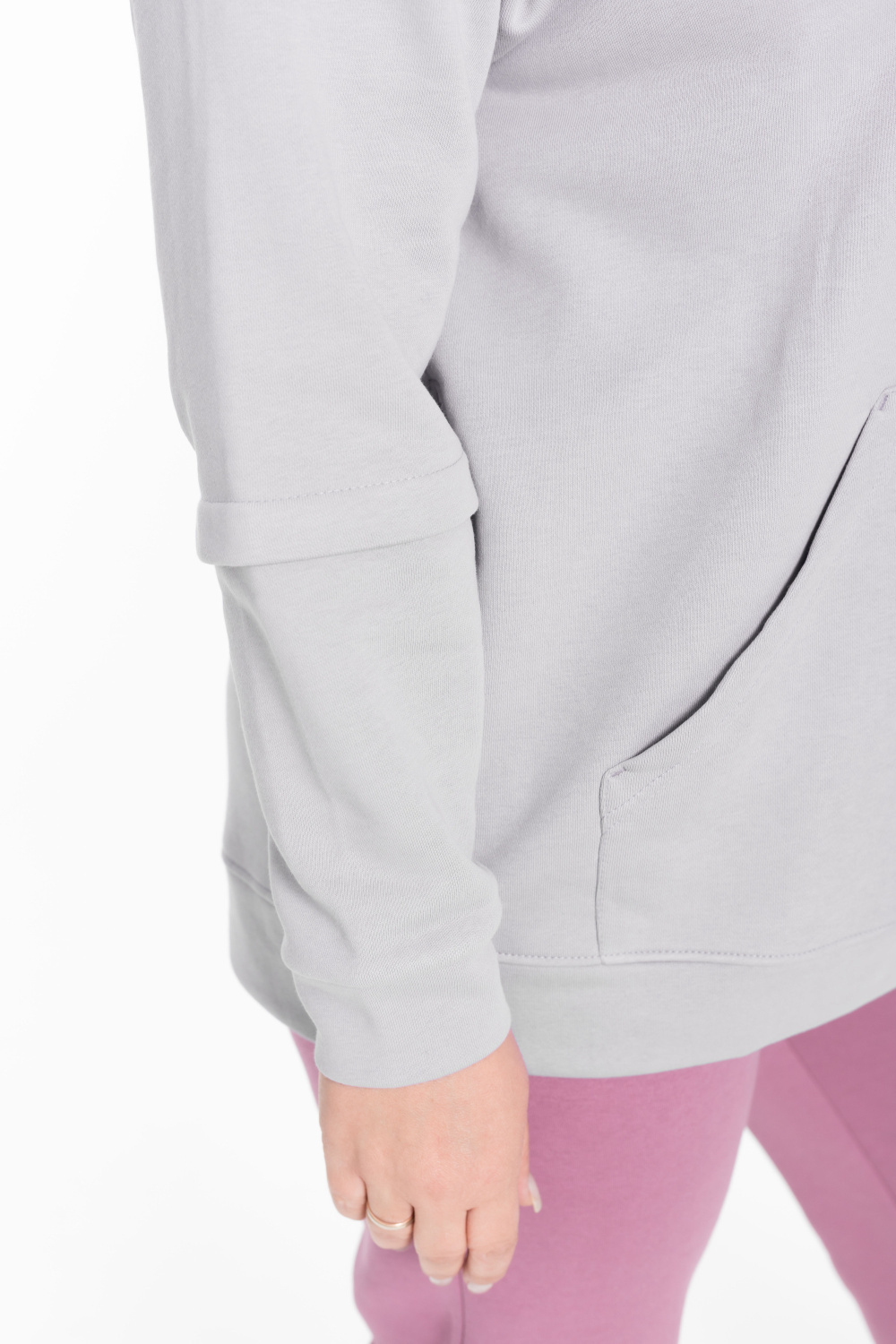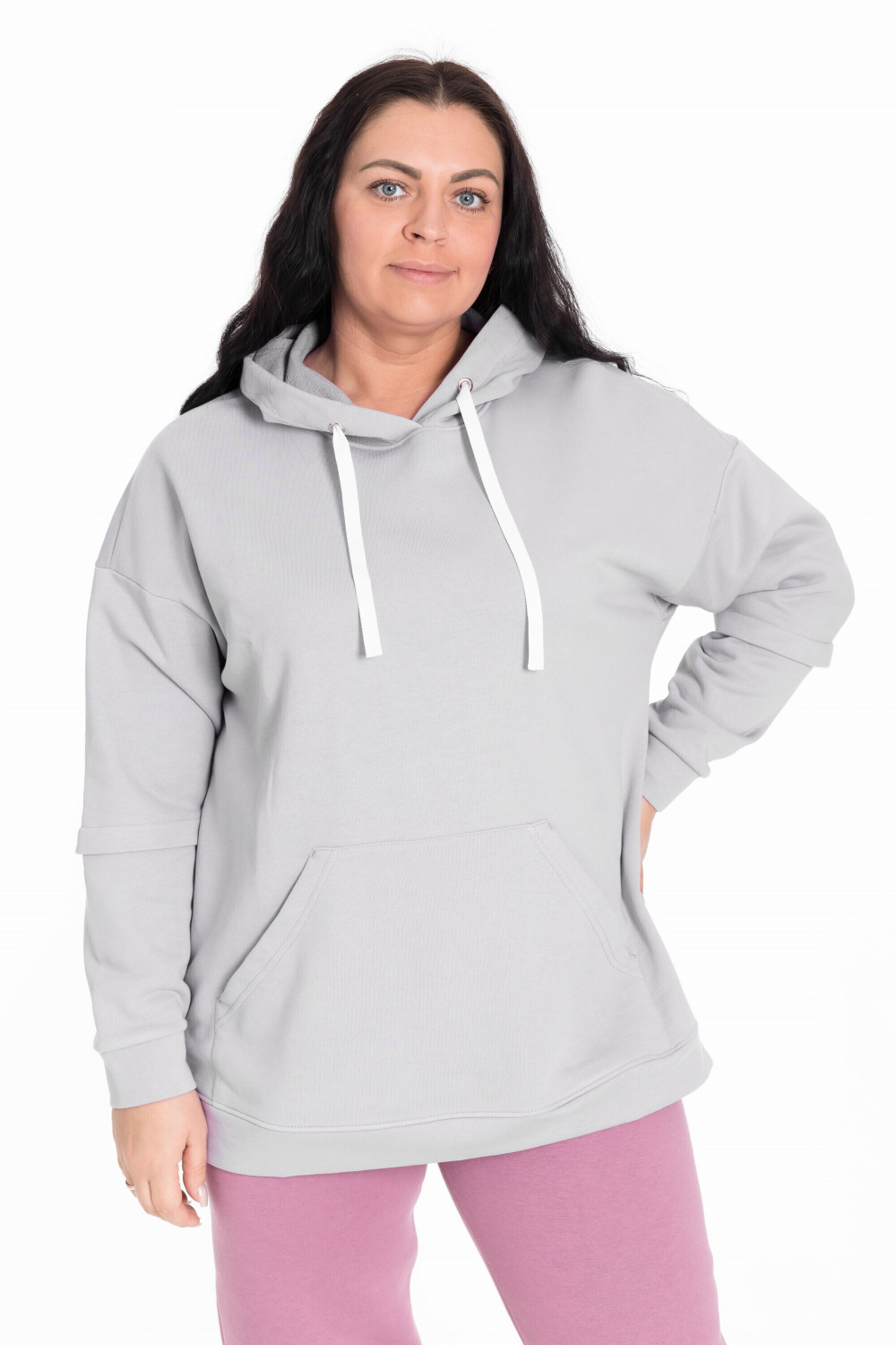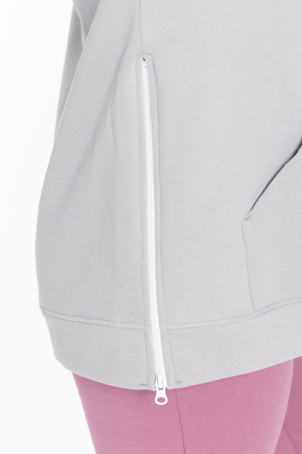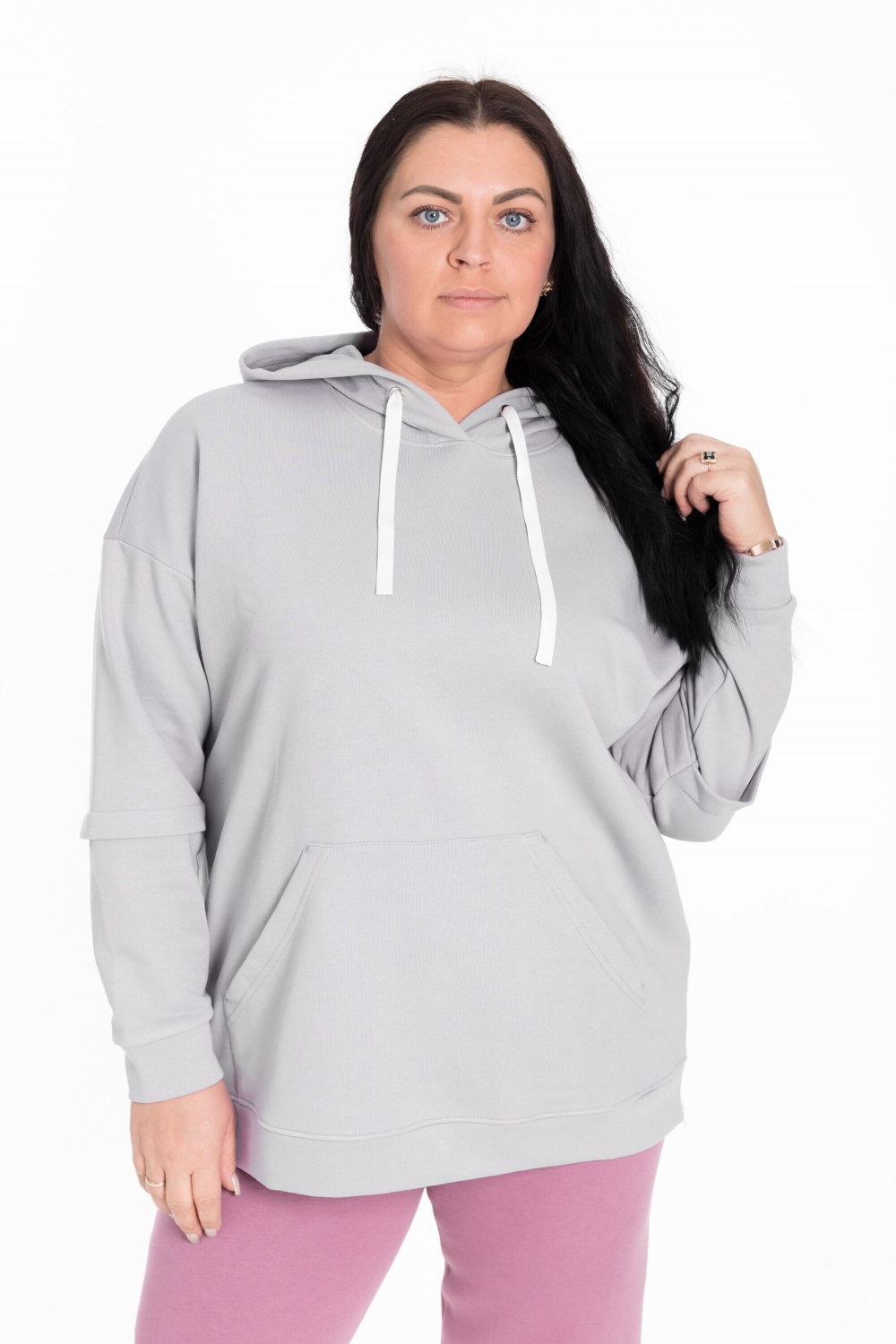 Женская толстовка из футера трёхнитка (воздушка). Силуэт толстовки свободный, ширина капюшона регулируется шнуром. В боковых разрезах вшиты молнии. Спереди располагается карман-кенгуру.