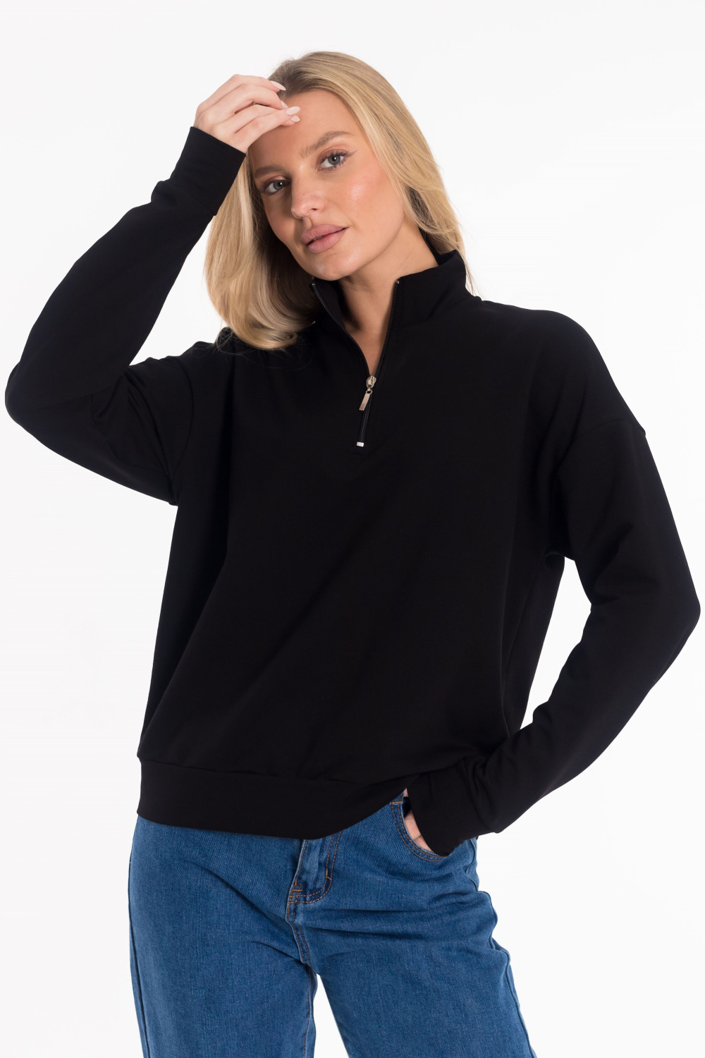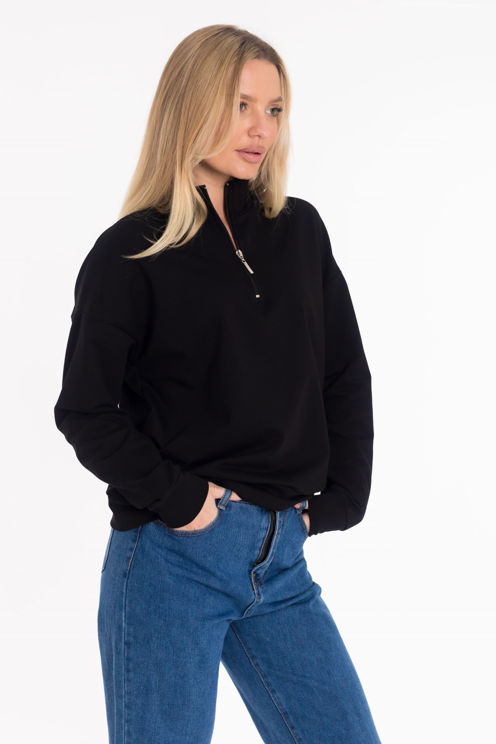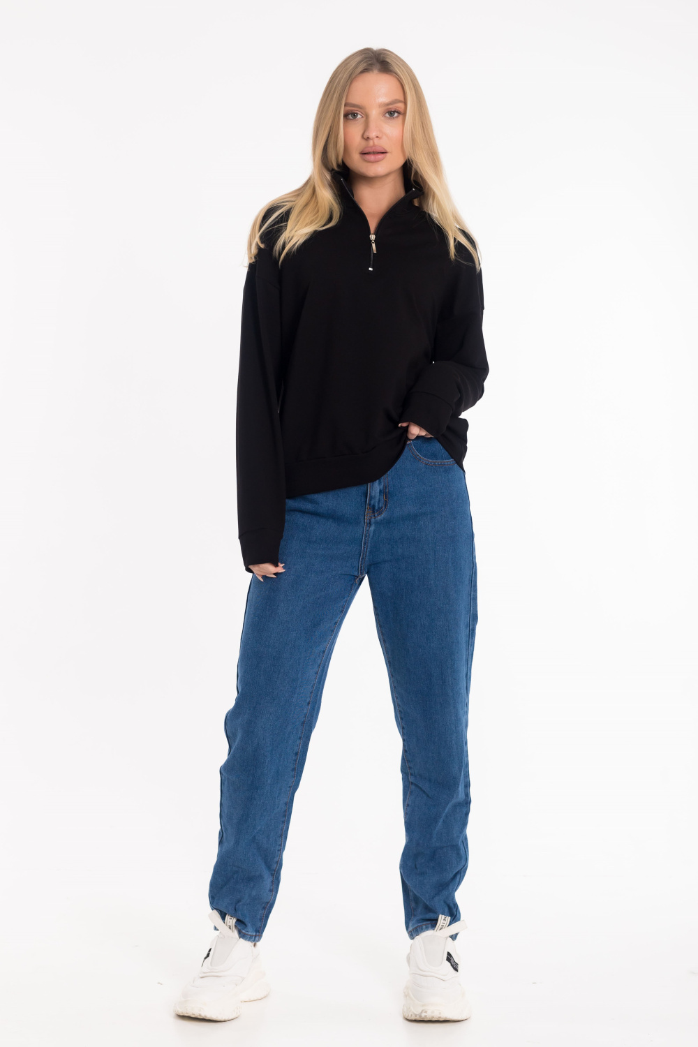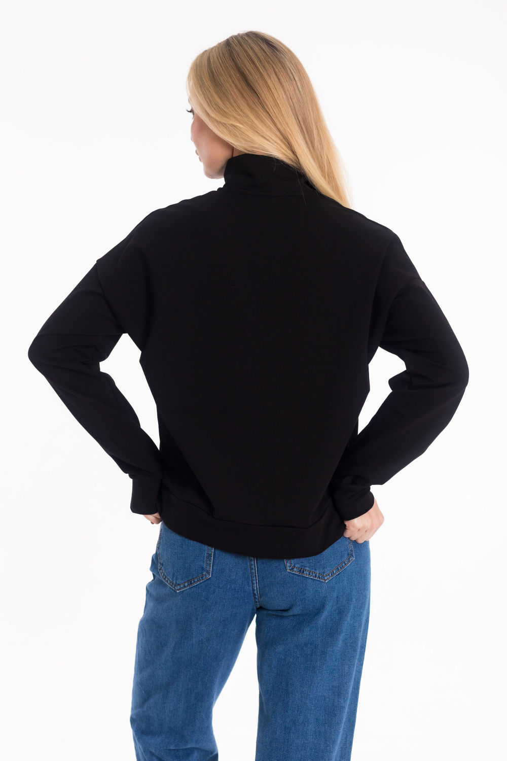Стильная толстовка выполнена из футера двухнитки. Модель с удобной короткой застежкой на молнию и практичным воротником-стойкой, обеспечивающим дополнительное тепло и комфорт. Рукава дополнены манжетами из основного полотна. Низ изделия оформлен притачным поясом для аккуратной посадки.