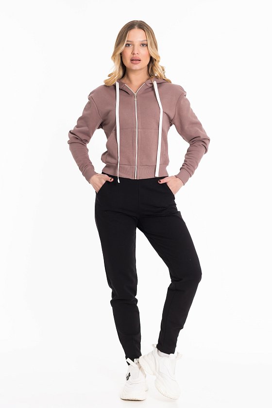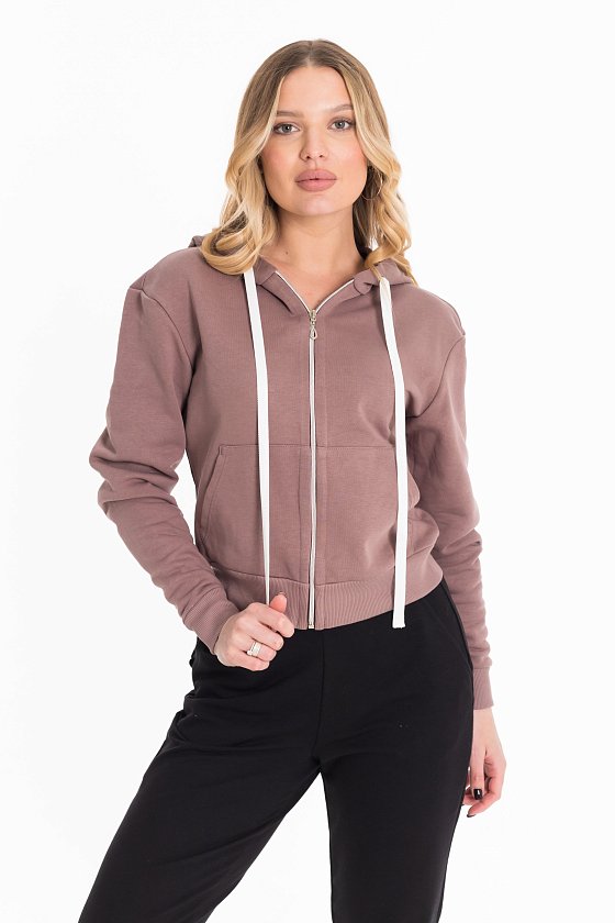 Толстовка выполнена из футера трёхнитки (воздушка). Капюшон со шнуром, манжеты рукавов и пояс изделия из кашкорсе. Спереди карманы.