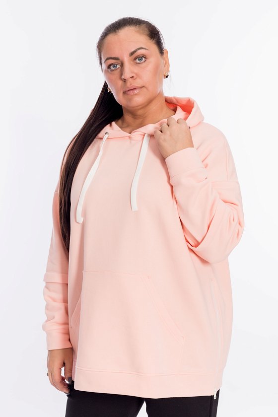 Женская толстовка из футера трёхнитка (воздушка). Силуэт толстовки свободный, ширина капюшона регулируется шнуром. В боковых разрезах вшиты молнии. Спереди располагается карман-кенгуру.