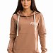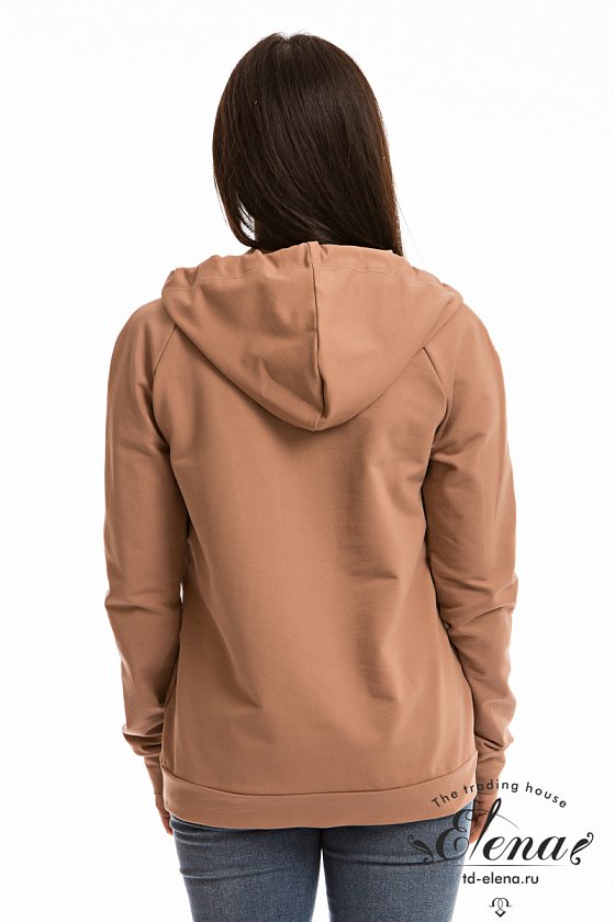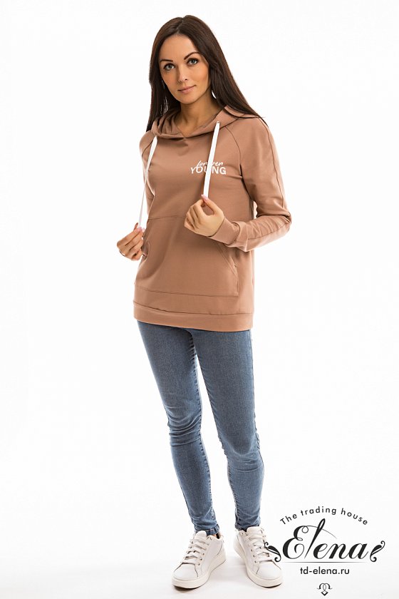 Женская толстовка с карманом-кенгуру выполнена из футер петли с лайкрой. Спереди и на правом рукаве нанесён принт, ширина капюшона регулируется шнуром.