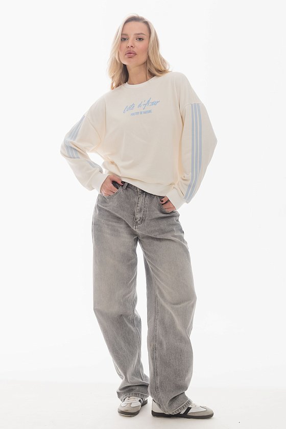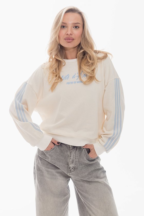 Женская толстовка выполнена из футера трехнитки «воздушка», что делает изделие мягким и комфортным в носке. Модель свободного кроя со спущенным рукавом обеспечивает удобство и стильный силуэт. Горловина, пояс и манжеты выполнены из эластичного кашкорсе для лучшей посадки. Рукава украшены лампасами, придающими образу динамичность, а спереди расположен аккуратный принт, добавляющий яркий акцент. Отличный выбор для повседневных образов.
