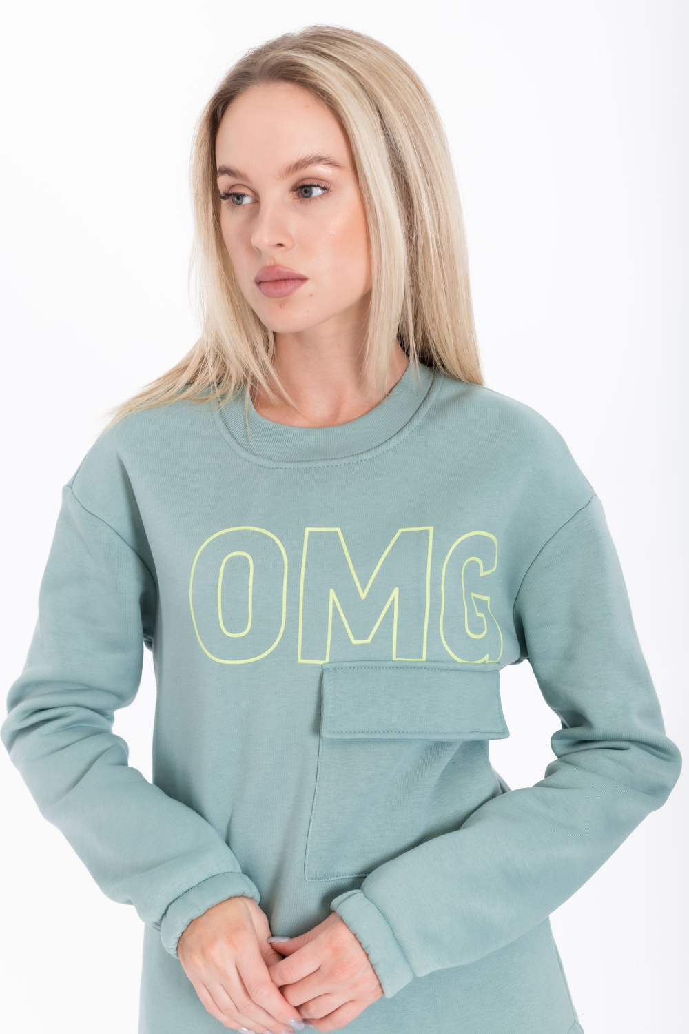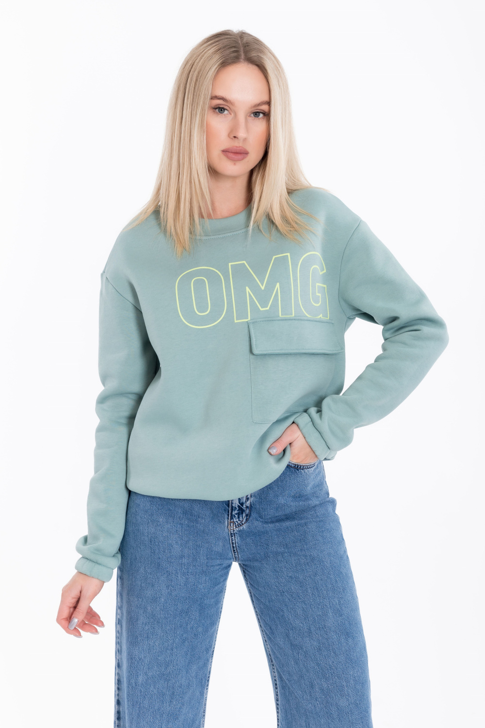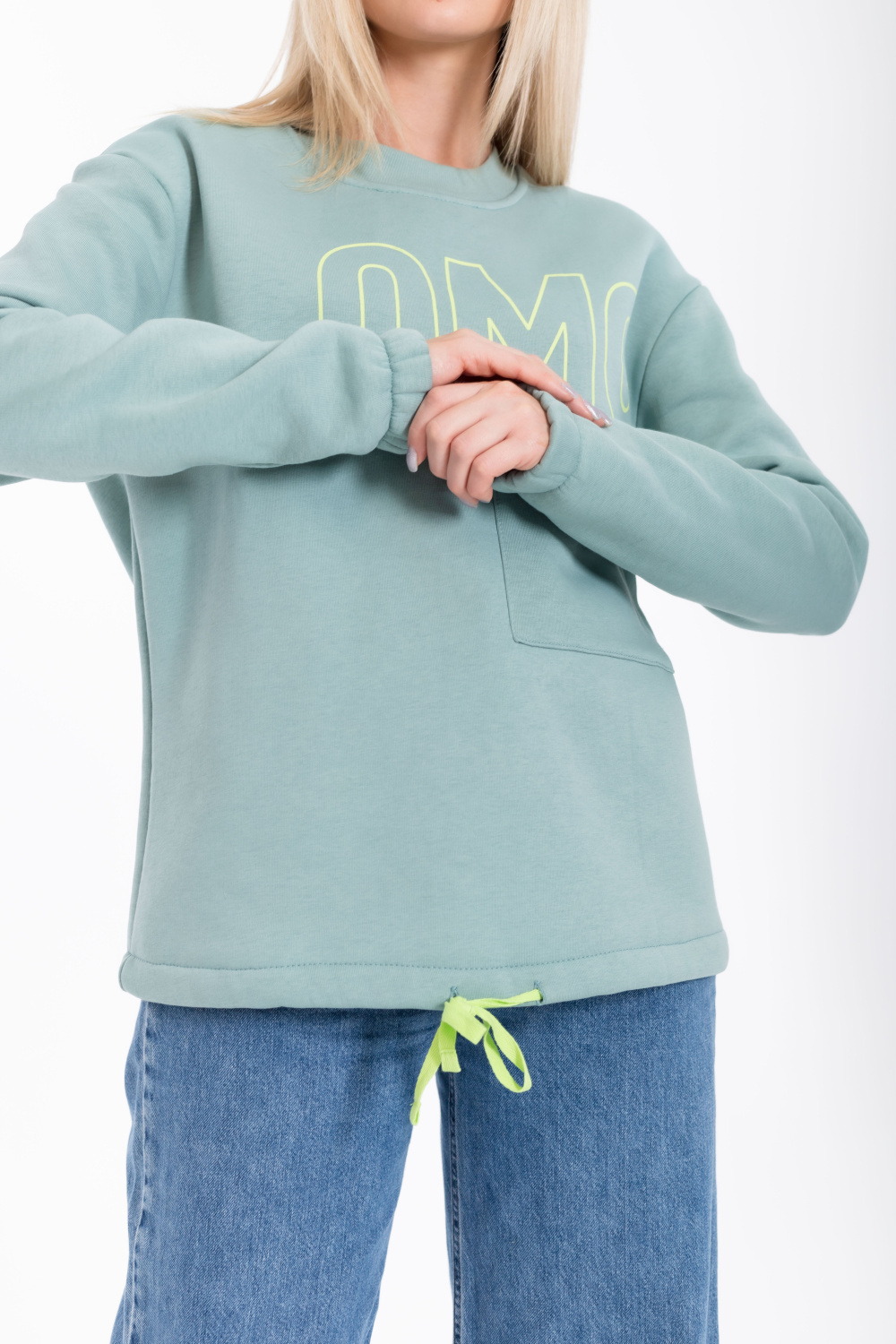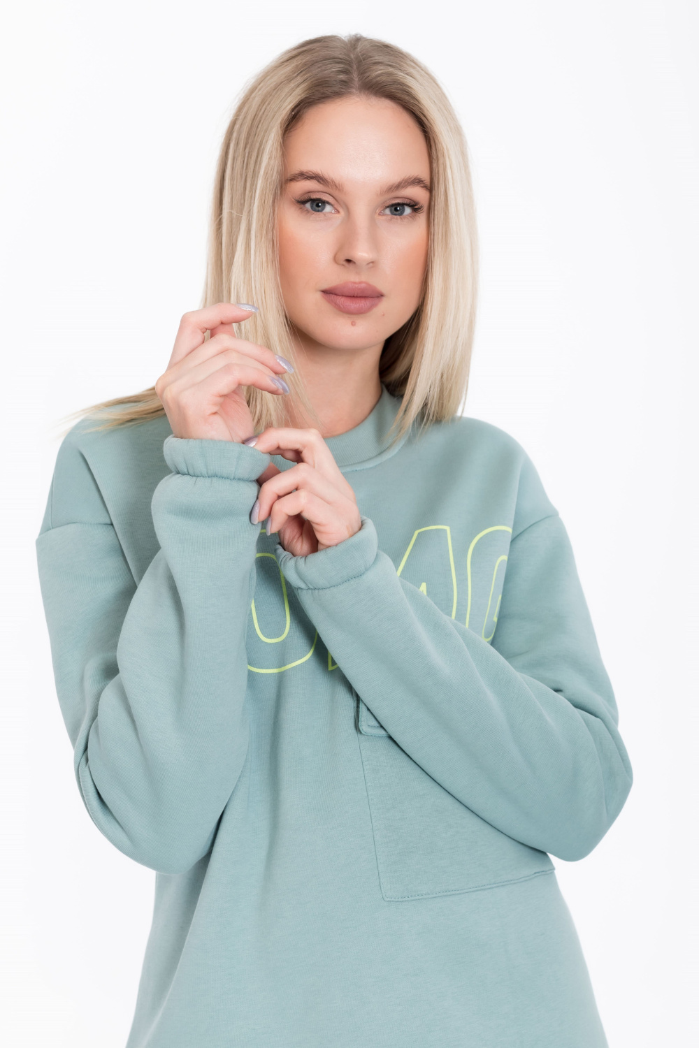 Женская толстовка из однотонного футера 3-х нитки с начёсом в цвете полынь - стильное и уютное изделие. Свободный крой и спущенный рукав с манжетами на резинке создают комфортный и модный образ. Декоративный большой карман поверх принта придает изделию оригинальность и интересный акцент.