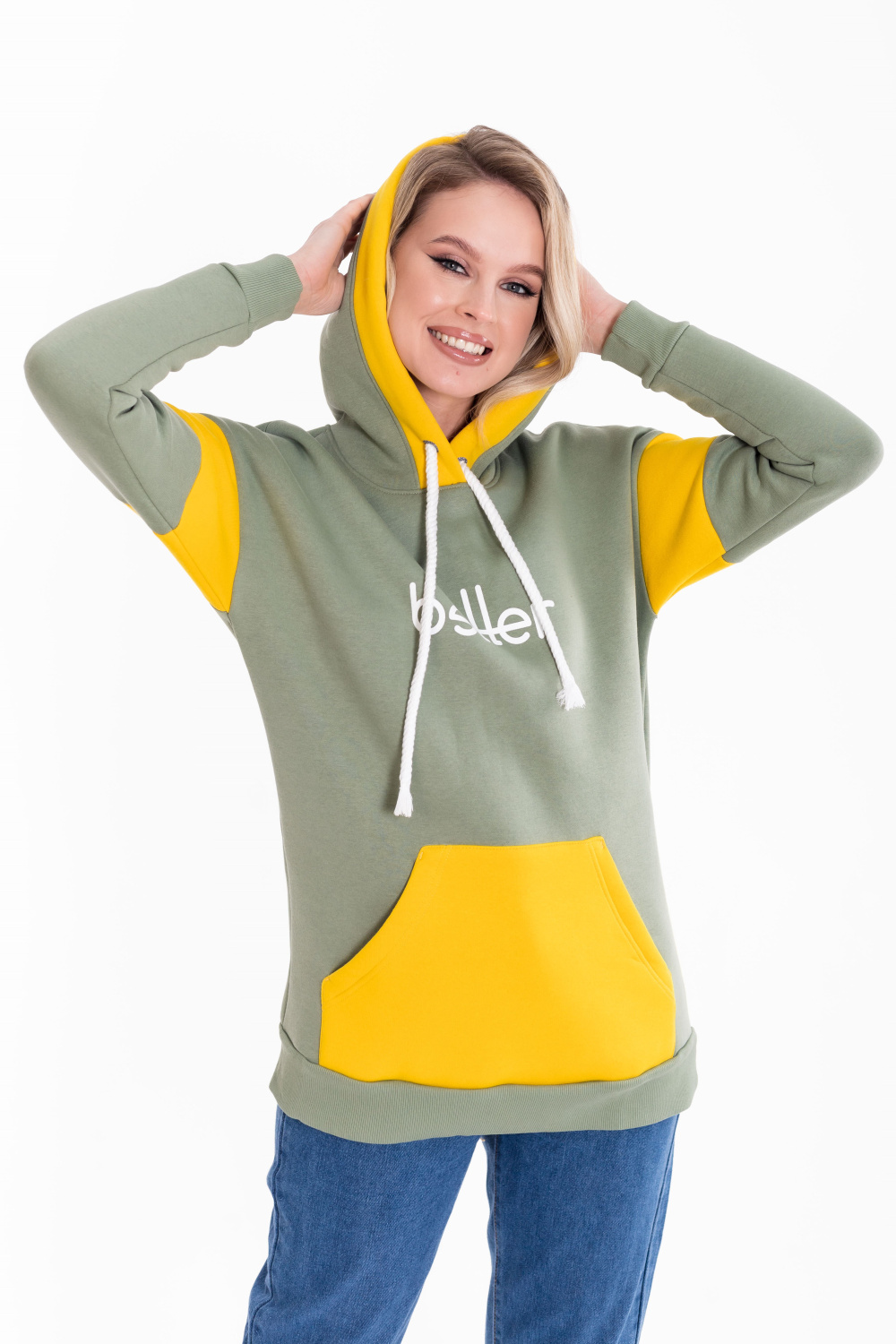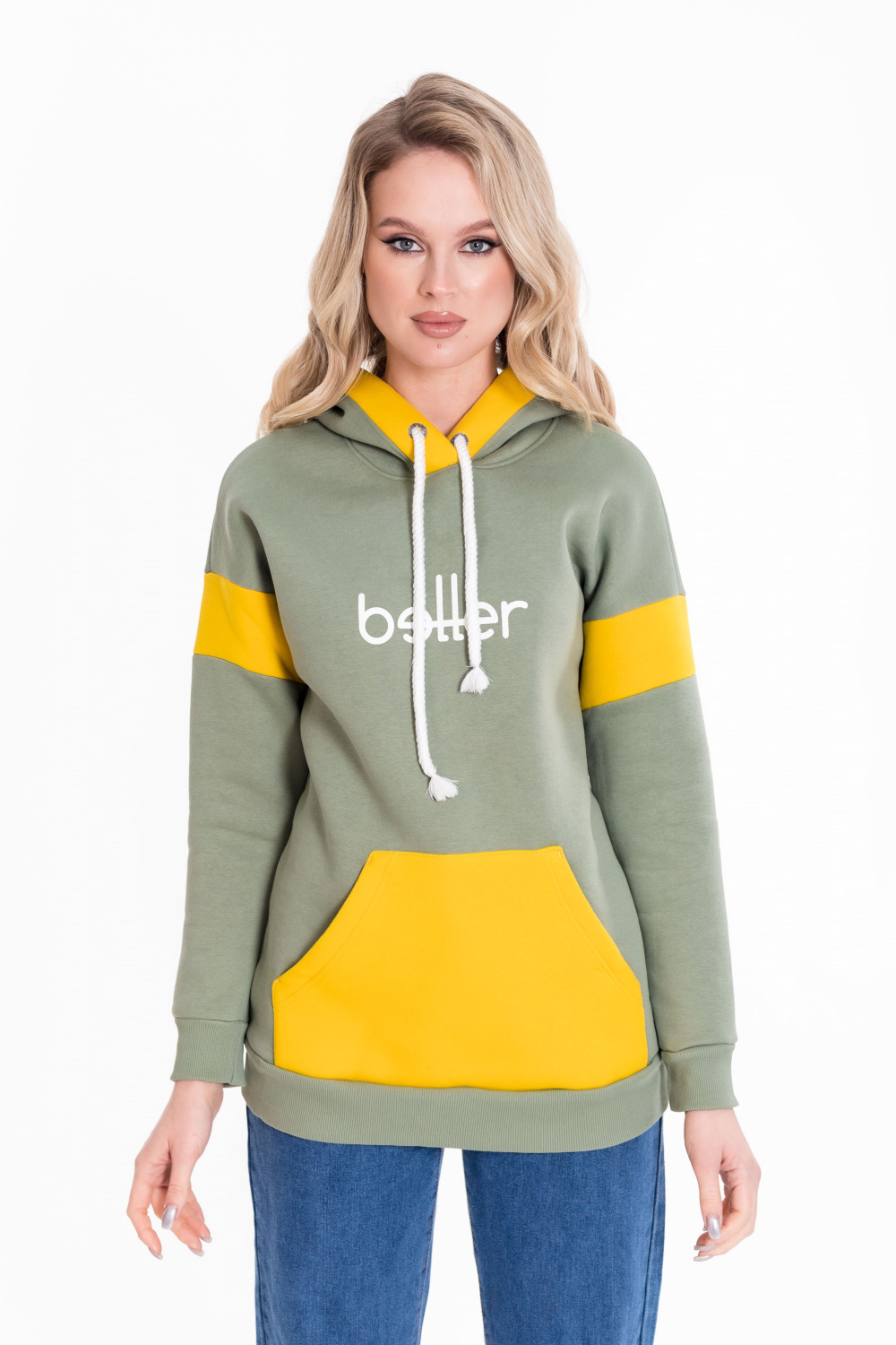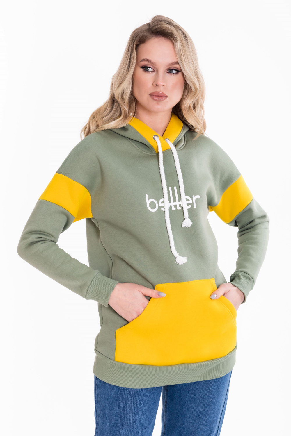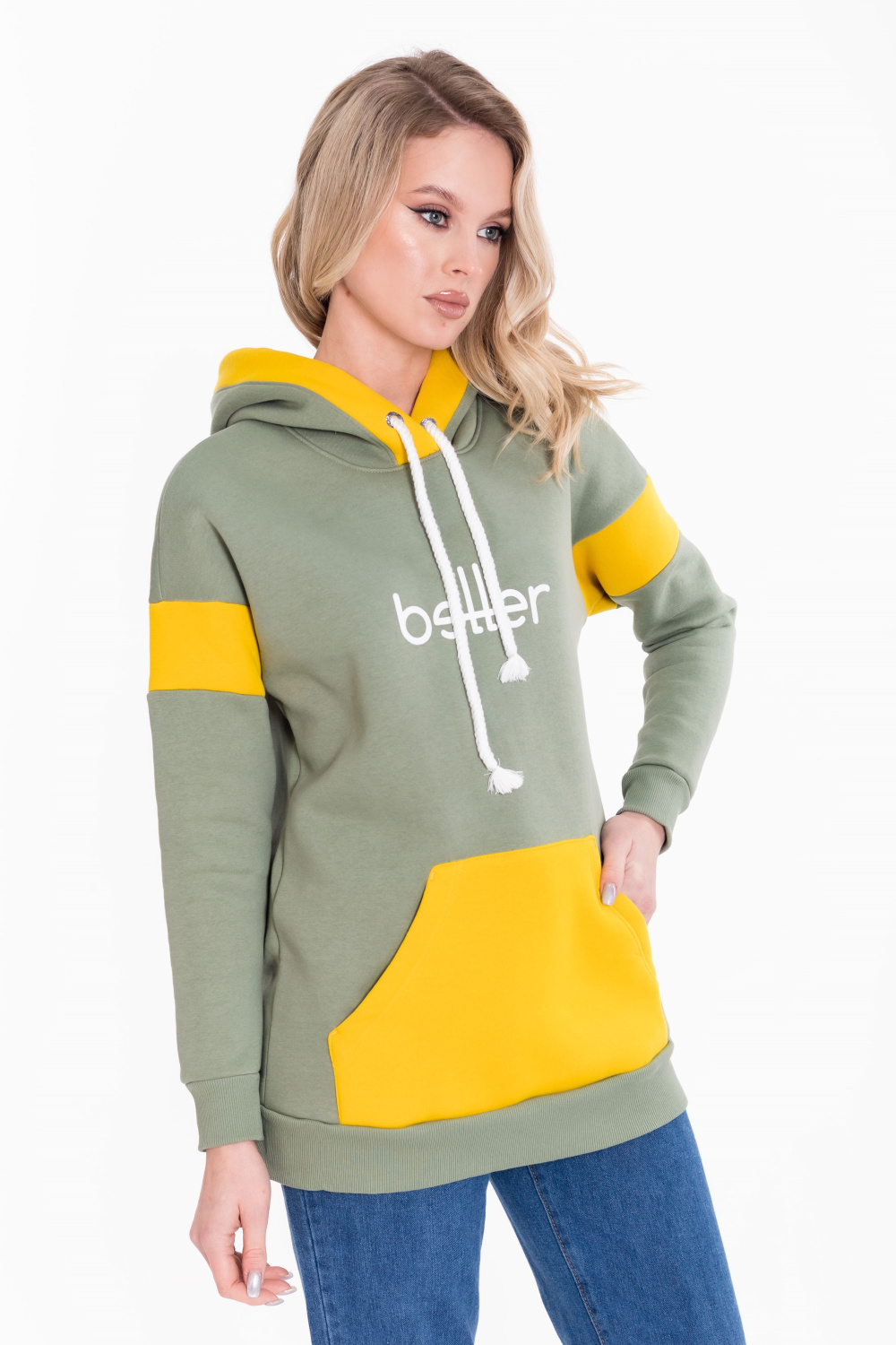 Толстовка выполнена из полотна с начёсом. Толстовка с длинным рукавом, притачными манжетами и поясом. Спереди расположен накладной карман-кенгуру и нанесён принт. Капюшон с планкой с люверсами, через которые проложен шнур.